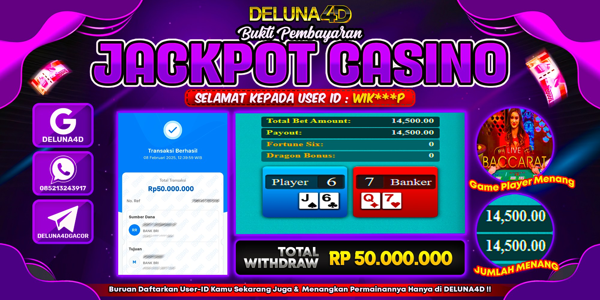 Selamat atas kemenangan User ID : WIK***P, yang telah berhasil mendapatkan kemenangan di permainan LIVE CASINO BACCARAT dengan kemenangan sebesar Rp50.000.000,- . Setelah mengisi formulir withdraw, hanya dalam jangka waktu 3-5 menitan tim layanan pelanggan DELUNA4D telah berhasil mengirimkan semua saldo kemenangan ke User ID tersebut.