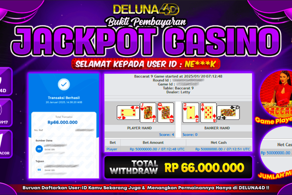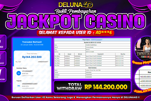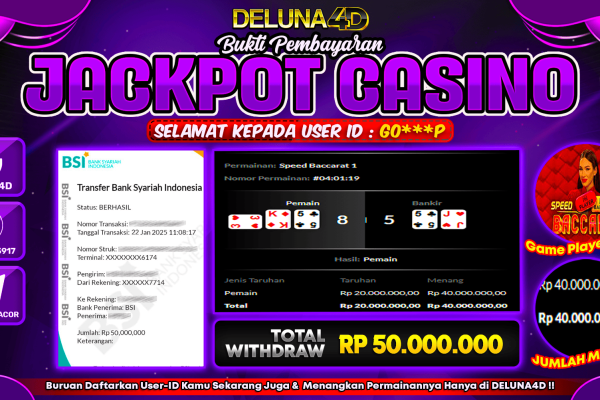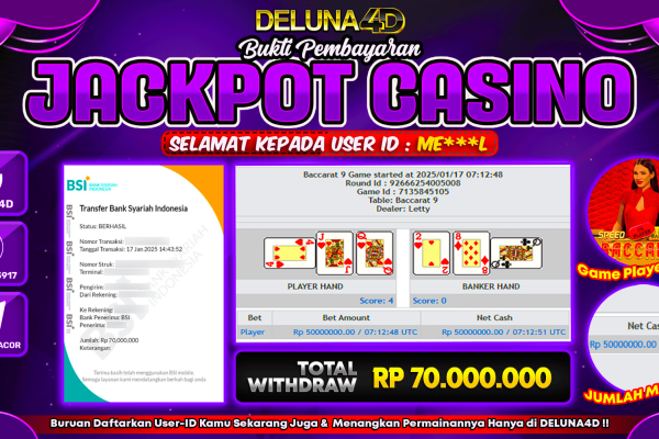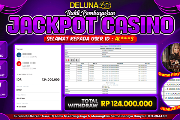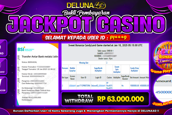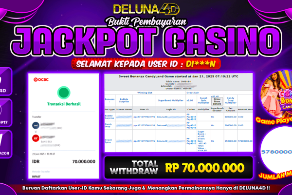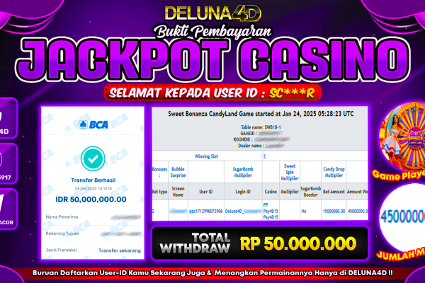 Selamat atas kemenangan User ID : SC***R, yang telah berhasil mendapatkan kemenangan di permainan LIVE CASINO SWEET BONANZA CANDYLAND dengan kemenangan sebesar Rp50.000.000,- . Setelah mengisi formulir withdraw, hanya dalam jangka waktu 3-5 menitan tim layanan pelanggan DELUNA4D telah berhasil mengirimkan semua saldo kemenangan ke User ID tersebut. Kami ucapkan Terima Kasih sebesar-besarnya pada pemenang…