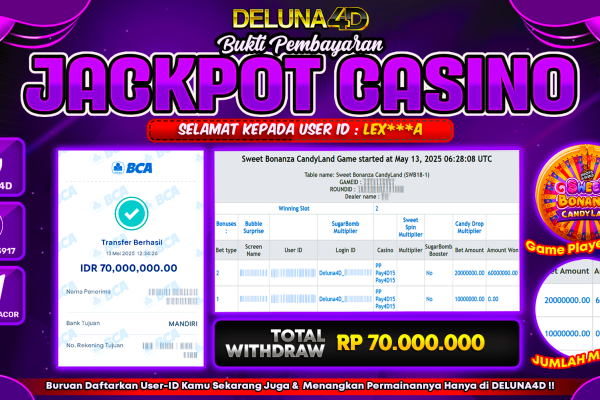 Selamat atas kemenangan User ID :  LEX***A, yang telah berhasil mendapatkan kemenangan di permainan LIVE CASINO -SWEET BONANZA CANDYLAND dengan kemenangan sebesar Rp70.000.000,- . Setelah mengisi formulir withdraw, hanya dalam jangka waktu 3-5 menitan tim layanan pelanggan DELUNA4D telah berhasil mengirimkan semua saldo kemenangan ke User ID tersebut. Kami ucapkan Terima Kasih sebesar-besarnya pada pemenang…