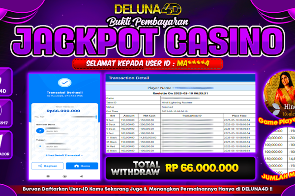 Selamat atas kemenangan User ID :  MA***4, yang telah berhasil mendapatkan kemenangan di permainan LIVE CASINO EVO – HINDI LIGHTNING ROULETTE dengan kemenangan sebesar Rp66.000.000,- . Setelah mengisi formulir withdraw, hanya dalam jangka waktu 3-5 menitan tim layanan pelanggan DELUNA4D telah berhasil mengirimkan semua saldo kemenangan ke User ID tersebut. Kami ucapkan Terima Kasih sebesar-besarnya…