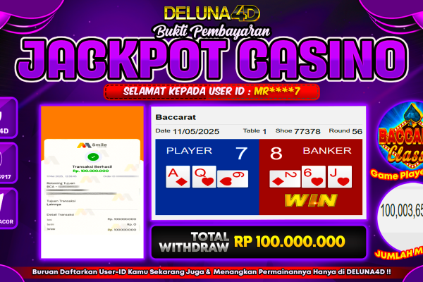 Selamat atas kemenangan User ID :  MR***7, yang telah berhasil mendapatkan kemenangan di permainan LIVE CASINO – BACCARAT CLASSIC dengan kemenangan sebesar Rp100.000.000,- . Setelah mengisi formulir withdraw, hanya dalam jangka waktu 3-5 menitan tim layanan pelanggan DELUNA4D telah berhasil mengirimkan semua saldo kemenangan ke User ID tersebut. Kami ucapkan Terima Kasih sebesar-besarnya pada pemenang…