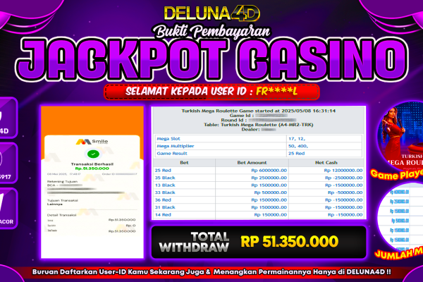 Selamat atas kemenangan User ID :  FR***L, yang telah berhasil mendapatkan kemenangan di permainan LIVE CASINO  – MEGA ROULETTE TURKISH dengan kemenangan sebesar Rp51.350.000,- . Setelah mengisi formulir withdraw, hanya dalam jangka waktu 3-5 menitan tim layanan pelanggan DELUNA4D telah berhasil mengirimkan semua saldo kemenangan ke User ID tersebut. Kami ucapkan Terima Kasih sebesar-besarnya pada…