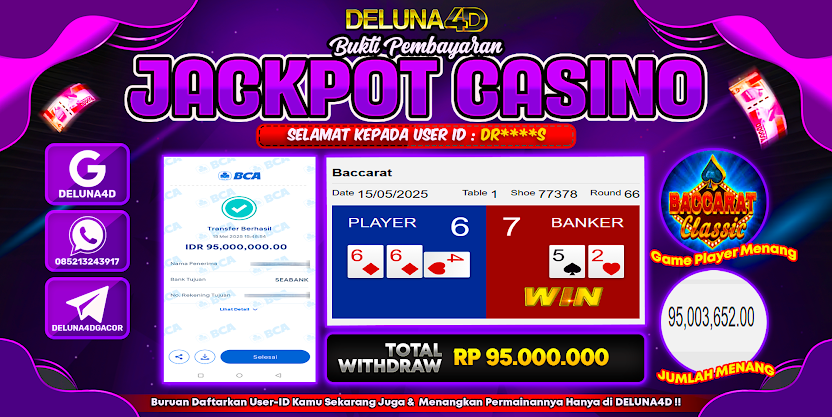 Selamat atas kemenangan User ID : DR***S, yang telah berhasil mendapatkan kemenangan di permainan LIVE CASINO – BACCARAT CLASSIC dengan kemenangan sebesar Rp95.000.000,- . Setelah mengisi formulir withdraw, hanya dalam jangka waktu 3-5 menitan tim layanan pelanggan DELUNA4D telah berhasil mengirimkan semua saldo kemenangan ke User ID tersebut.