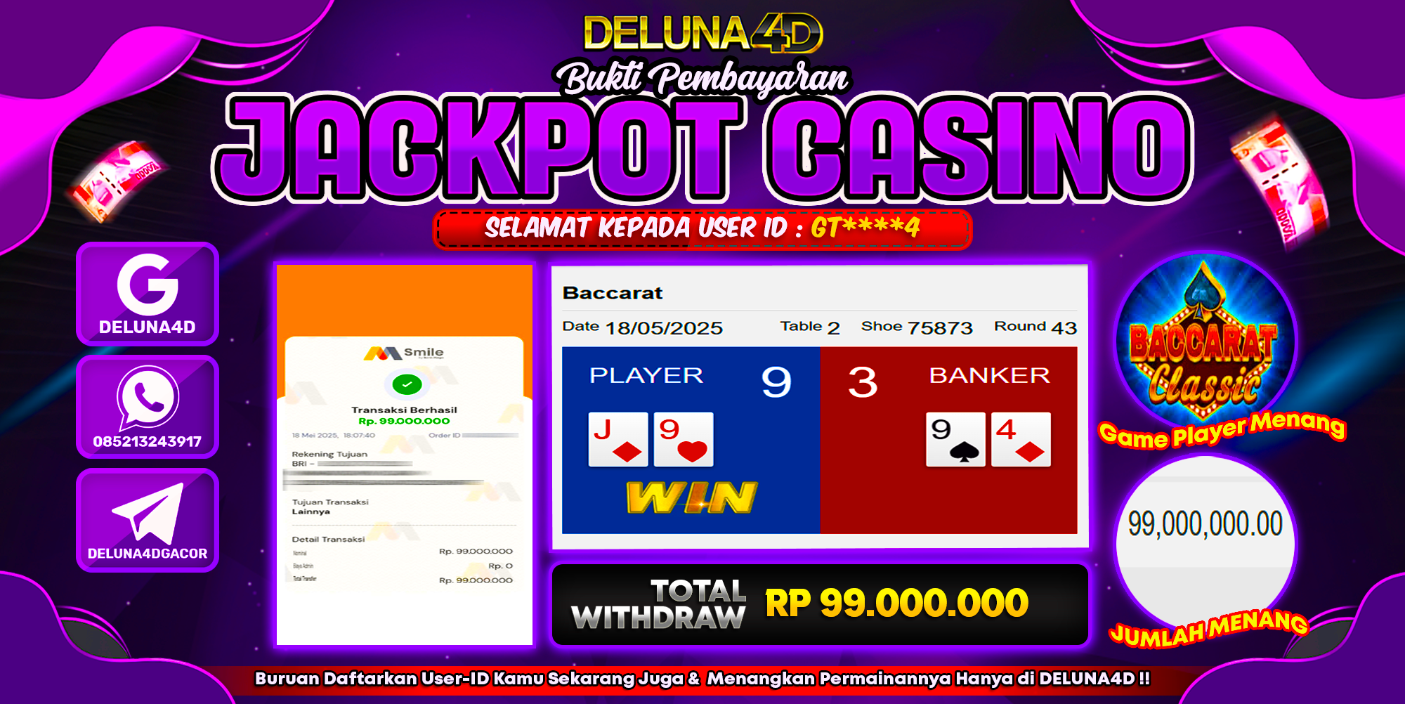 Selamat atas kemenangan User ID :  GT***4, yang telah berhasil mendapatkan kemenangan di permainan LIVE CASINO – BACCARAT CLASSIC dengan kemenangan sebesar Rp99.000.000,- . Setelah mengisi formulir withdraw, hanya dalam jangka waktu 3-5 menitan tim layanan pelanggan DELUNA4D telah berhasil mengirimkan semua saldo kemenangan ke User ID tersebut.