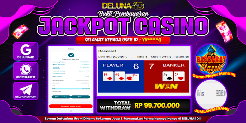 Selamat atas kemenangan User ID : YU***Q, yang telah berhasil mendapatkan kemenangan di permainan LIVE CASINO – BACCARAT CLASSIC dengan kemenangan sebesar Rp99.700.000,- . Setelah mengisi formulir withdraw, hanya dalam jangka waktu 3-5 menitan tim layanan pelanggan DELUNA4D telah berhasil mengirimkan semua saldo kemenangan ke User ID tersebut.