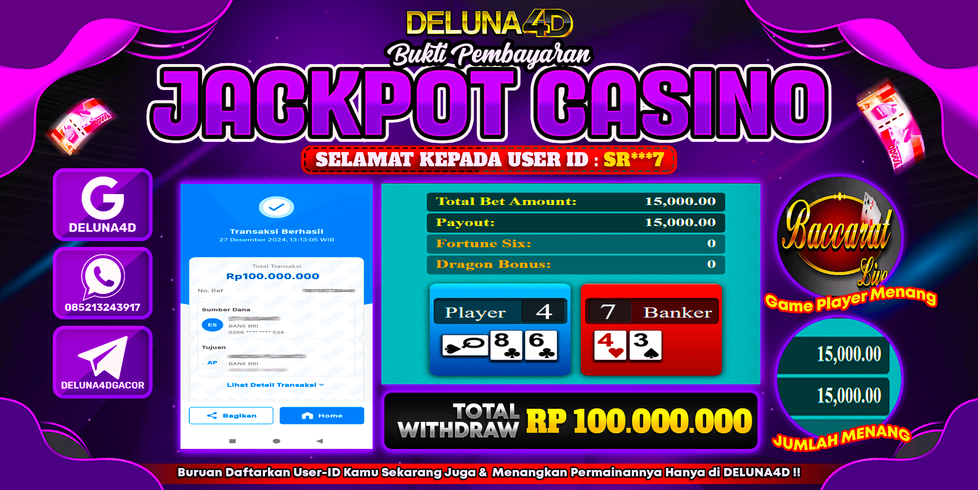 Selamat atas kemenangan User ID : SR***7, yang telah berhasil mendapatkan kemenangan di permainan LIVE CASINO EVO BACCARAT dengan kemenangan sebesar Rp100.000.000,- . Setelah mengisi formulir withdraw, hanya dalam jangka waktu 3-5 menitan tim layanan pelanggan DELUNA4D telah berhasil mengirimkan semua saldo kemenangan ke User ID tersebut.