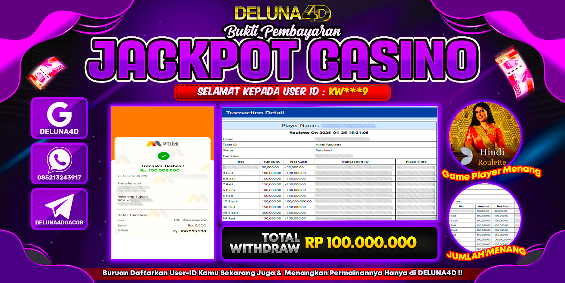 Selamat atas kemenangan User ID : KW***9, yang telah berhasil mendapatkan kemenangan di permainan LIVE CASINO EVO HINDI ROULETTE dengan kemenangan sebesar Rp100.000.000,- . Setelah mengisi formulir withdraw, hanya dalam jangka waktu 3-5 menitan tim layanan pelanggan DELUNA4D telah berhasil mengirimkan semua saldo kemenangan ke User ID tersebut.