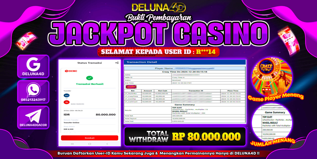 Selamat atas kemenangan User ID : R***14, yang telah berhasil mendapatkan kemenangan di permainan LIVE CASINO EVOLUTION CRAZY TIME dengan kemenangan sebesar Rp 80.000.000,- . Setelah mengisi formulir withdraw, hanya dalam jangka waktu 3-5 menitan tim layanan pelanggan DELUNA4D telah berhasil menegirimkan semua saldo kemenangan ke User ID tersebut.
