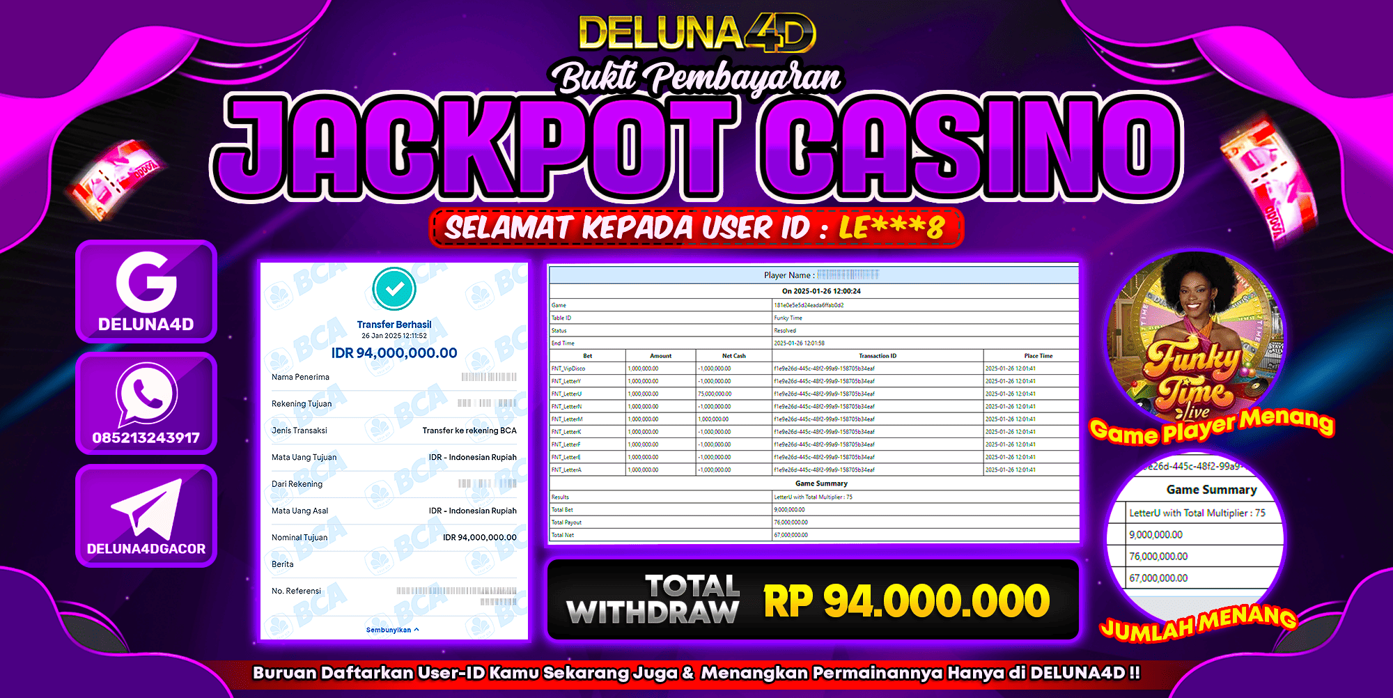 Selamat atas kemenangan User ID : LE***8, yang telah berhasil mendapatkan kemenangan di permainan LIVE CASINO EVOLUTION FUNKY TIME dengan kemenangan sebesar Rp94.000.000,- . Setelah mengisi formulir withdraw, hanya dalam jangka waktu 3-5 menitan tim layanan pelanggan DELUNA4D telah berhasil mengirimkan semua saldo kemenangan ke User ID tersebut.