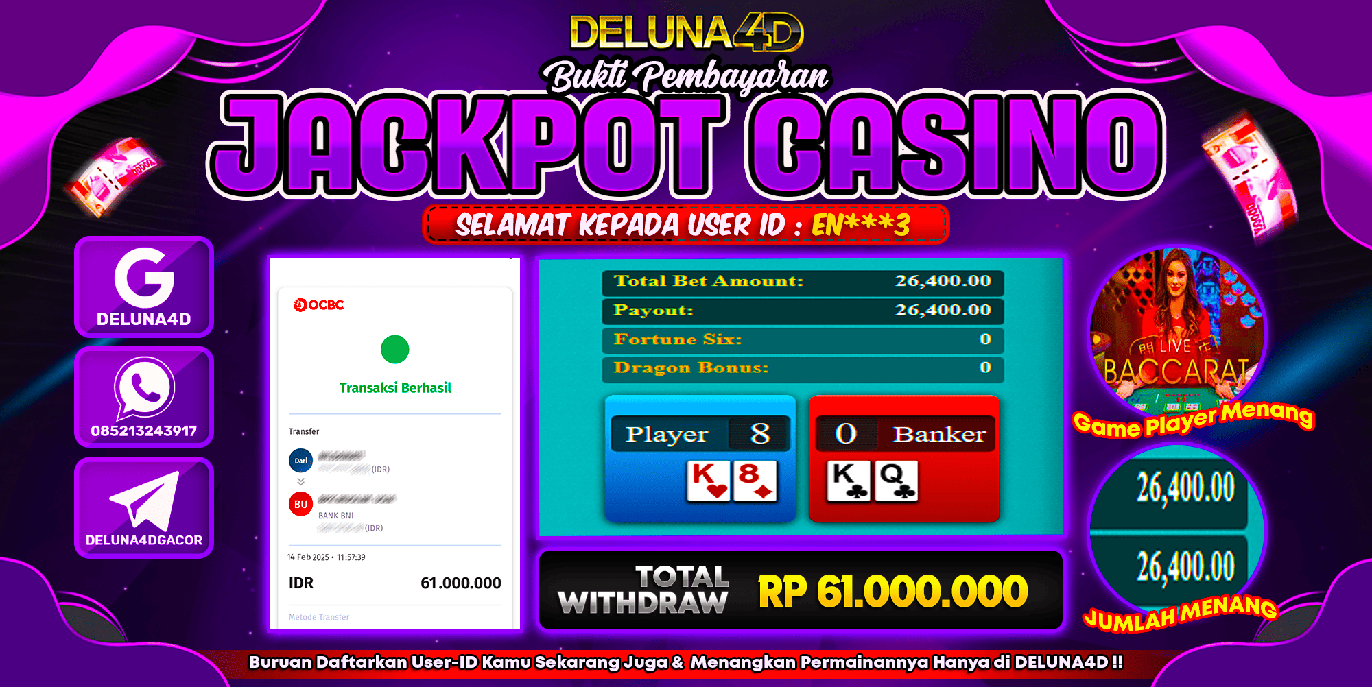 Selamat atas kemenangan User ID : EN***3, yang telah berhasil mendapatkan kemenangan di permainan LIVE CASINO EVOLUTION LIVE CASINO dengan kemenangan sebesar Rp61.000.000,- . Setelah mengisi formulir withdraw, hanya dalam jangka waktu 3-5 menitan tim layanan pelanggan DELUNA4D telah berhasil mengirimkan semua saldo kemenangan ke User ID tersebut.