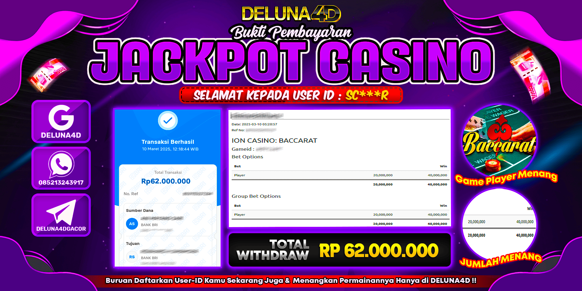 Selamat atas kemenangan User ID : SC***R, yang telah berhasil mendapatkan kemenangan di permainan LIVE CASINO ION CASINO BACCARAT dengan kemenangan sebesar Rp62.000.000,- . Setelah mengisi formulir withdraw, hanya dalam jangka waktu 3-5 menitan tim layanan pelanggan DELUNA4D telah berhasil mengirimkan semua saldo kemenangan ke User ID tersebut.