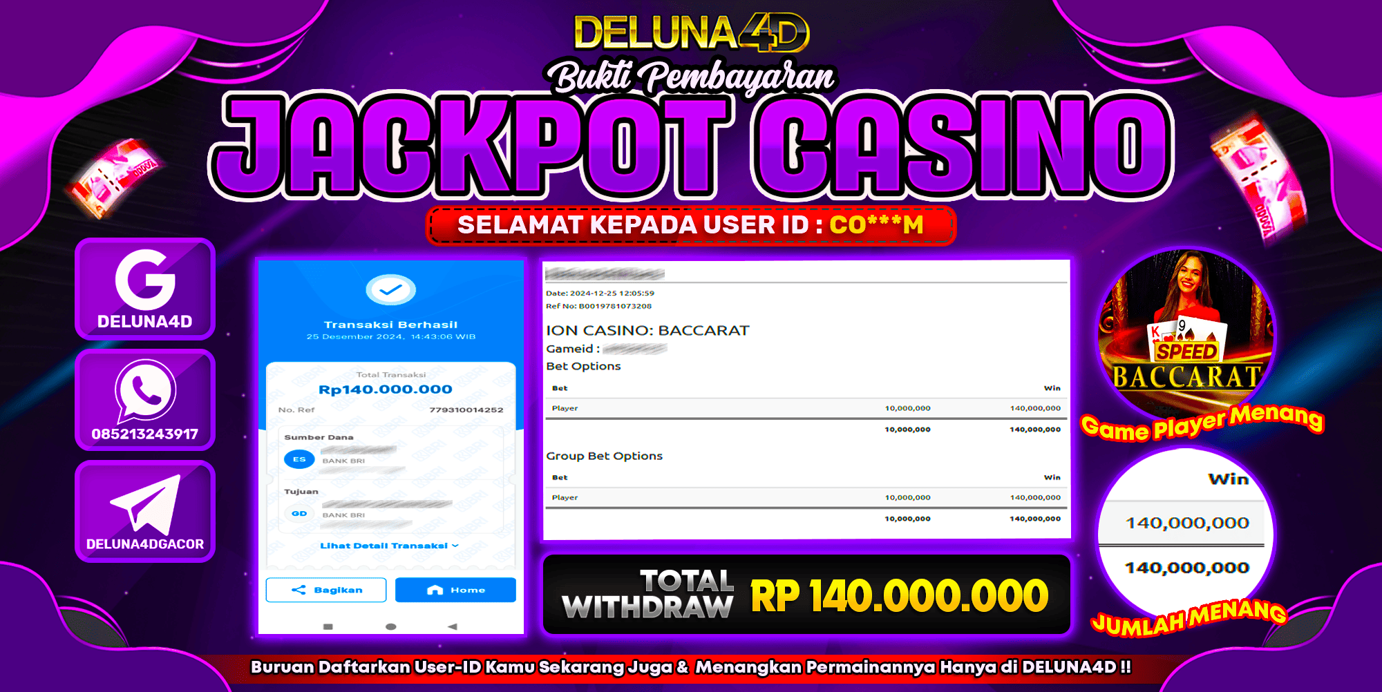 Selamat atas kemenangan User ID : CO***M, yang telah berhasil mendapatkan kemenangan di permainan LIVE CASINO ION CASINO : SPEED BACCARAT dengan kemenangan sebesar Rp140.000.000,- . Setelah mengisi formulir withdraw, hanya dalam jangka waktu 3-5 menitan tim layanan pelanggan DELUNA4D telah berhasil mengirimkan semua saldo kemenangan ke User ID tersebut.