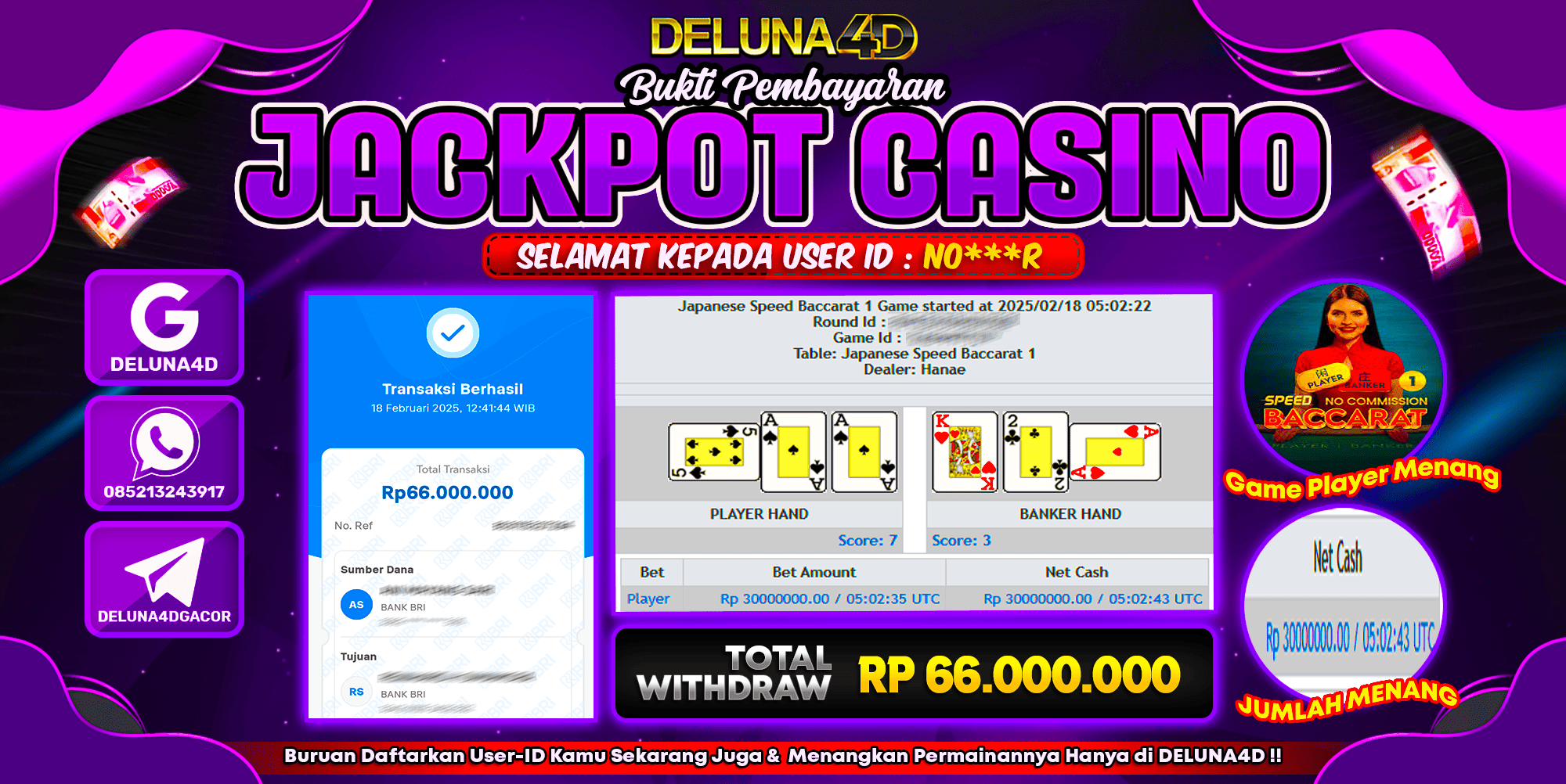 Selamat atas kemenangan User ID : NO***R, yang telah berhasil mendapatkan kemenangan di permainan LIVE CASINO JAPANESE SPEED BACCARAT dengan kemenangan sebesar Rp66.000.000,- . Setelah mengisi formulir withdraw, hanya dalam jangka waktu 3-5 menitan tim layanan pelanggan DELUNA4D telah berhasil mengirimkan semua saldo kemenangan ke User ID tersebut.
