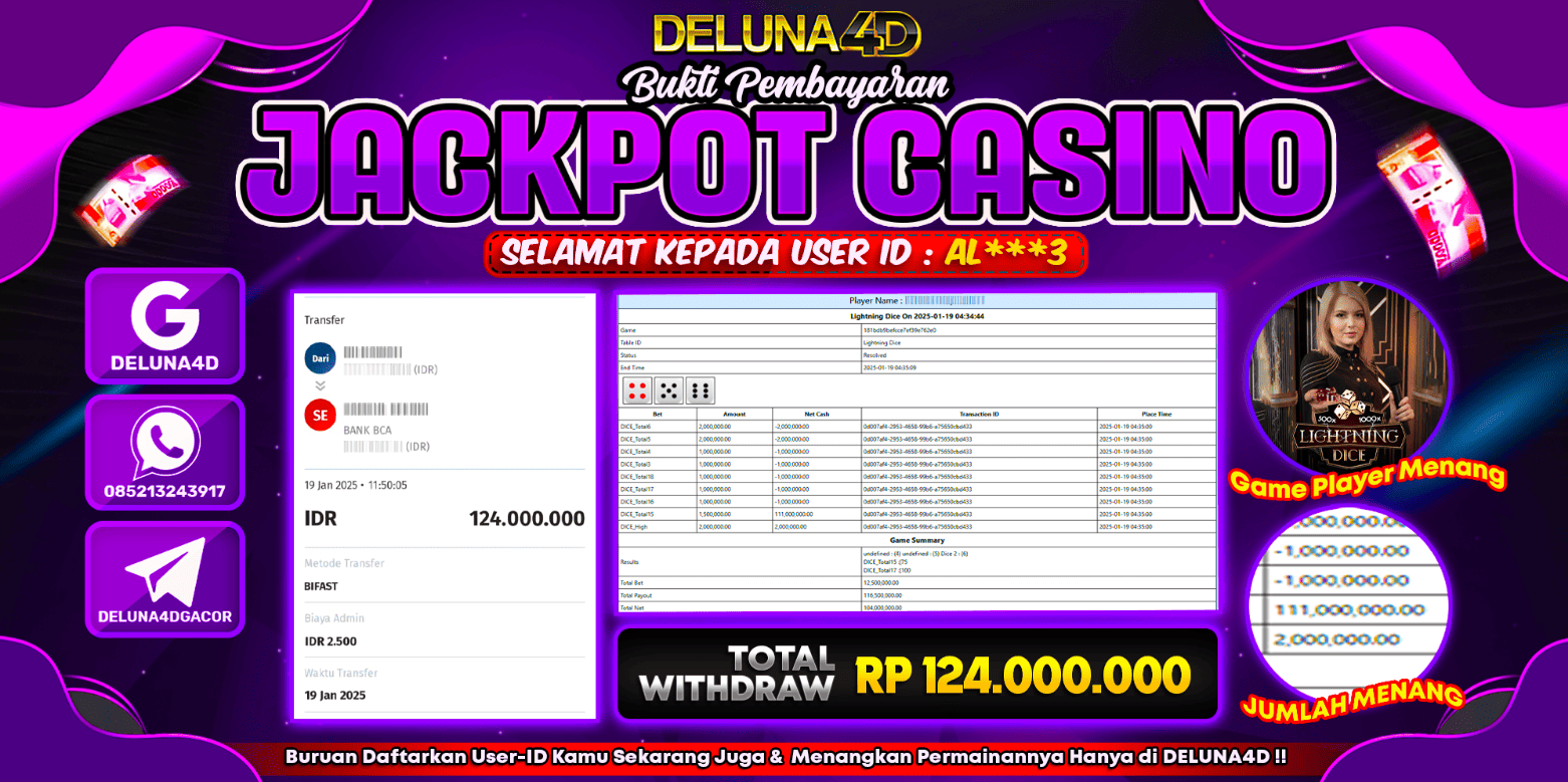 Selamat atas kemenangan User ID : AL***3, yang telah berhasil mendapatkan kemenangan di permainan LIVE CASINO LIGHTNING DICE dengan kemenangan sebesar Rp124.000.000,- . Setelah mengisi formulir withdraw, hanya dalam jangka waktu 3-5 menitan tim layanan pelanggan DELUNA4D telah berhasil mengirimkan semua saldo kemenangan ke User ID tersebut.