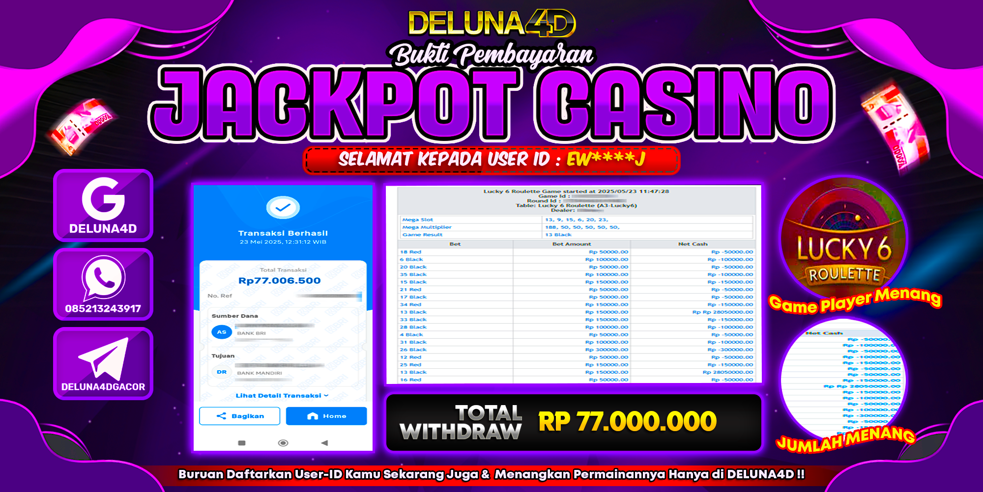 Selamat atas kemenangan User ID : EW***J, yang telah berhasil mendapatkan kemenangan di permainan LIVE CASINO – LUCKY 6 ROULETTE dengan kemenangan sebesar Rp77.000.000,- . Setelah mengisi formulir withdraw, hanya dalam jangka waktu 3-5 menitan tim layanan pelanggan DELUNA4D telah berhasil mengirimkan semua saldo kemenangan ke User ID tersebut.
