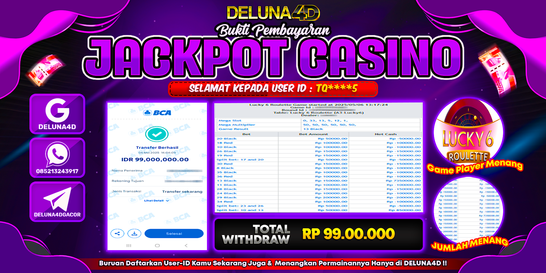 Selamat atas kemenangan User ID : TQ***5, yang telah berhasil mendapatkan kemenangan di permainan LIVE CASINO LUCKY 6 ROULETTE dengan kemenangan sebesar Rp99.000.000,- . Setelah mengisi formulir withdraw, hanya dalam jangka waktu 3-5 menitan tim layanan pelanggan DELUNA4D telah berhasil mengirimkan semua saldo kemenangan ke User ID tersebut.