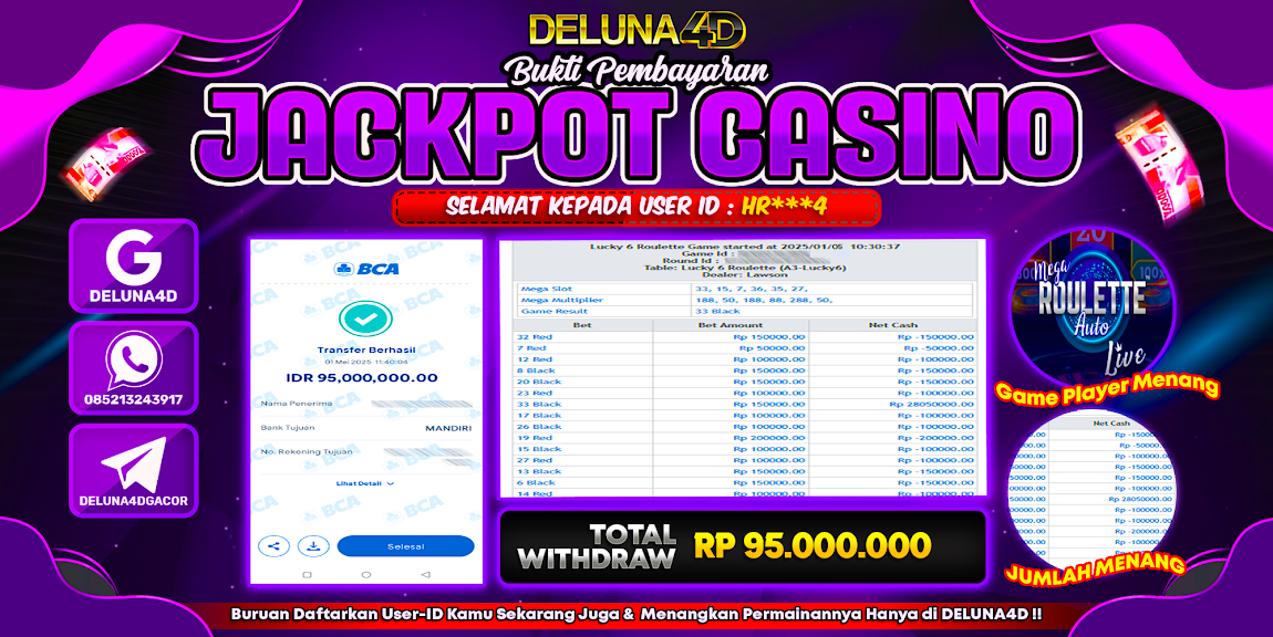 Selamat atas kemenangan User ID : HR***4, yang telah berhasil mendapatkan kemenangan di permainan LIVE CASINO MEGA ROULETTE dengan kemenangan sebesar Rp95.000.000,- . Setelah mengisi formulir withdraw, hanya dalam jangka waktu 3-5 menitan tim layanan pelanggan DELUNA4D telah berhasil mengirimkan semua saldo kemenangan ke User ID tersebut.