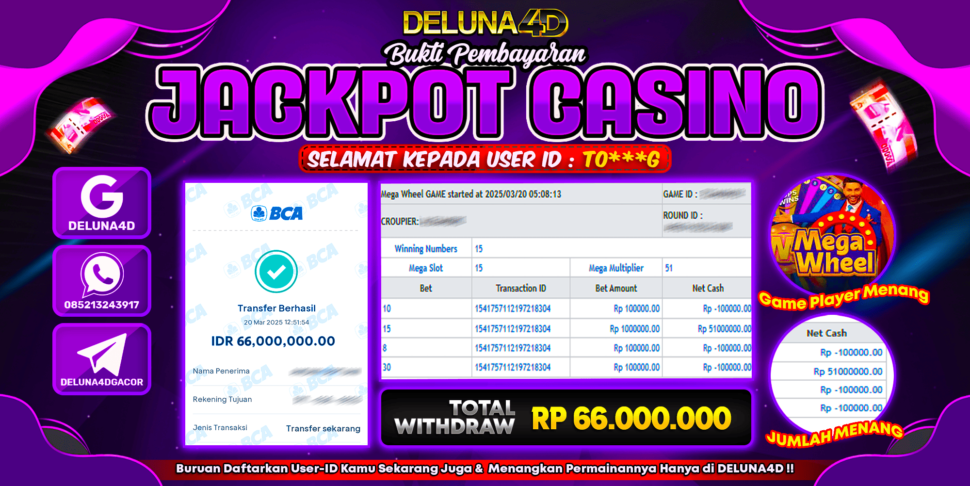 Selamat atas kemenangan User ID : TO***G, yang telah berhasil mendapatkan kemenangan di permainan LIVE CASINO MEGA WHEEL dengan kemenangan sebesar Rp66.000.000,- . Setelah mengisi formulir withdraw, hanya dalam jangka waktu 3-5 menitan tim layanan pelanggan DELUNA4D telah berhasil mengirimkan semua saldo kemenangan ke User ID tersebut.