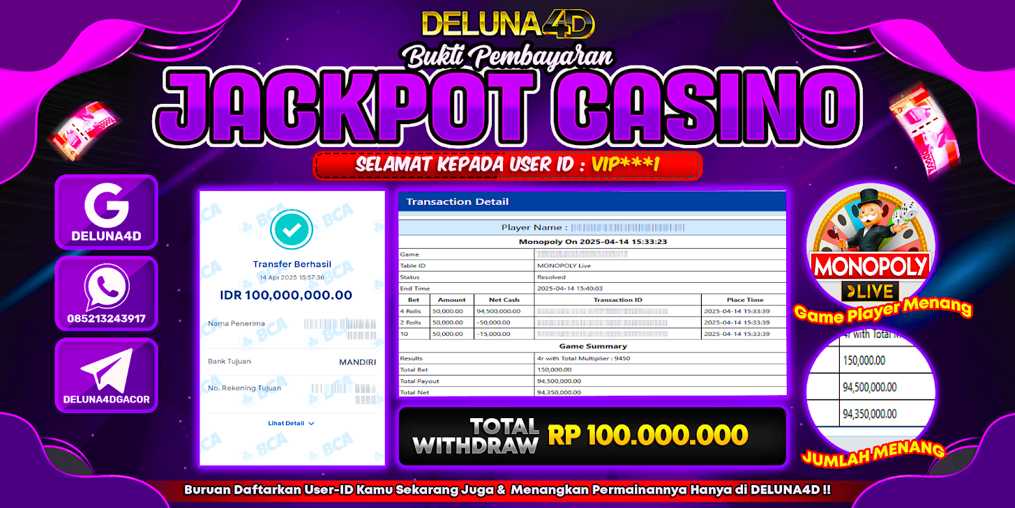 Selamat atas kemenangan User ID : VIP***I, yang telah berhasil mendapatkan kemenangan di permainan LIVE CASINO MONOPOLY LIVE dengan kemenangan sebesar Rp100.000.000,- . Setelah mengisi formulir withdraw, hanya dalam jangka waktu 3-5 menitan tim layanan pelanggan DELUNA4D telah berhasil mengirimkan semua saldo kemenangan ke User ID tersebut.