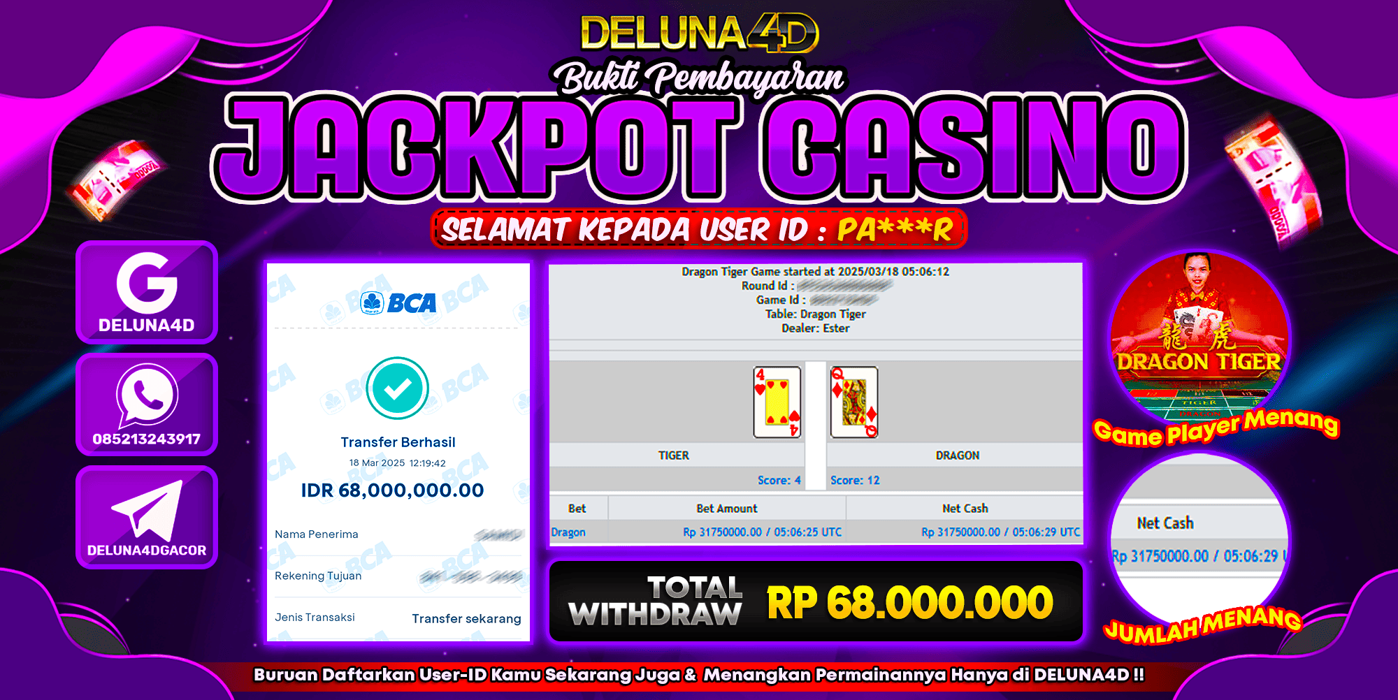 Selamat atas kemenangan User ID : PA***R, yang telah berhasil mendapatkan kemenangan di permainan LIVE CASINO PRAGMATIC DRAGON TIGER LIVE dengan kemenangan sebesar Rp68.000.000,- . Setelah mengisi formulir withdraw, hanya dalam jangka waktu 3-5 menitan tim layanan pelanggan DELUNA4D telah berhasil mengirimkan semua saldo kemenangan ke User ID tersebut.