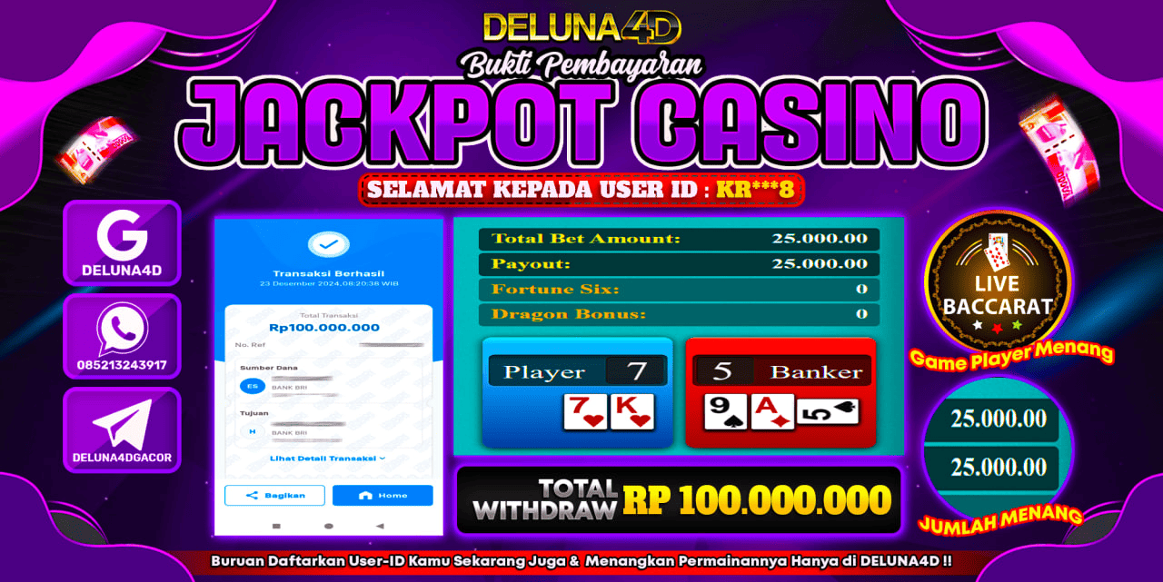 Selamat atas kemenangan User ID : KR***8, yang telah berhasil mendapatkan kemenangan di permainan LIVE CASINO PRAGMATIC LIVE BACCARAT dengan kemenangan sebesar Rp100.000.000,- . Setelah mengisi formulir withdraw, hanya dalam jangka waktu 3-5 menitan tim layanan pelanggan DELUNA4D telah berhasil menegirimkan semua saldo kemenangan ke User ID tersebut.