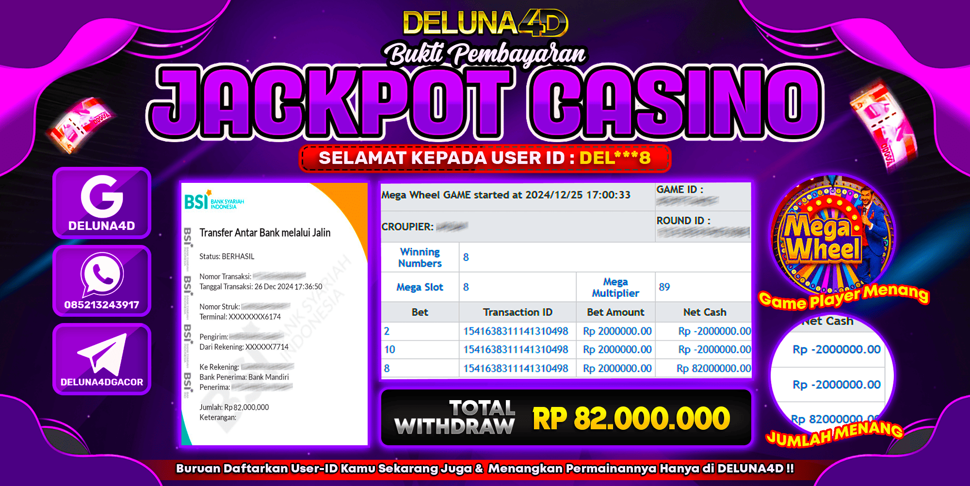 Selamat atas kemenangan User ID : DEL***8, yang telah berhasil mendapatkan kemenangan di permainan LIVE CASINO PRAGMATIC MEGA WHEEL dengan kemenangan sebesar Rp82.000.000,- . Setelah mengisi formulir withdraw, hanya dalam jangka waktu 3-5 menitan tim layanan pelanggan DELUNA4D telah berhasil mengirimkan semua saldo kemenangan ke User ID tersebut.