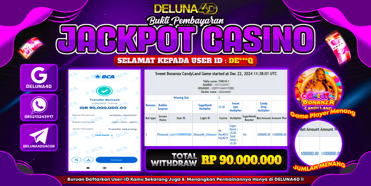 Selamat atas kemenangan User ID : DE***Q, yang telah berhasil mendapatkan kemenangan di permainan LIVE CASINO PRAGMATIC SWEET BONANZA CANDYLAND dengan kemenangan sebesar Rp90.000.000,- . Setelah mengisi formulir withdraw, hanya dalam jangka waktu 3-5 menitan tim layanan pelanggan DELUNA4D telah berhasil menegirimkan semua saldo kemenangan ke User ID tersebut.