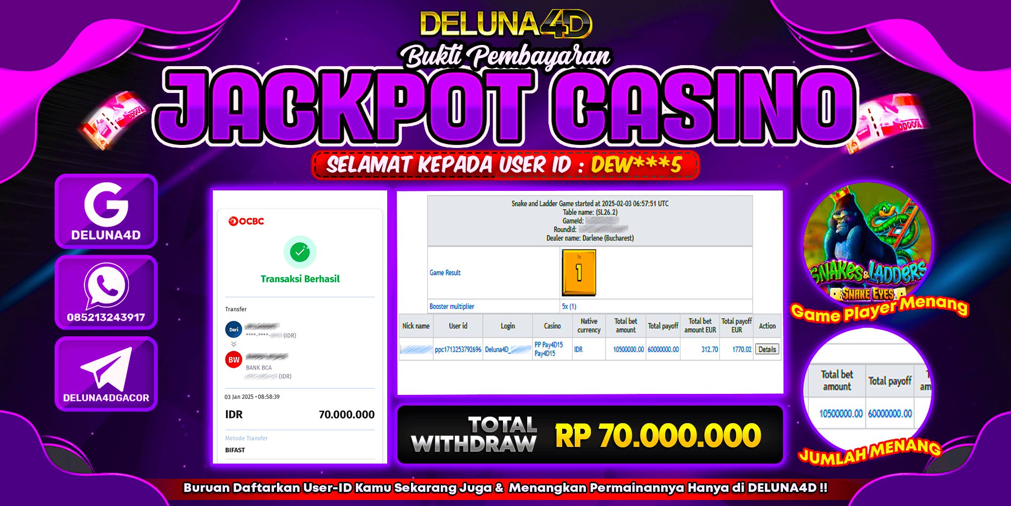 Selamat atas kemenangan User ID : DEW***5, yang telah berhasil mendapatkan kemenangan di permainan LIVE CASINO SNAKE & LADDERS – SNAKE EYES dengan kemenangan sebesar Rp70.000.000,- . Setelah mengisi formulir withdraw, hanya dalam jangka waktu 3-5 menitan tim layanan pelanggan DELUNA4D telah berhasil mengirimkan semua saldo kemenangan ke User ID tersebut.