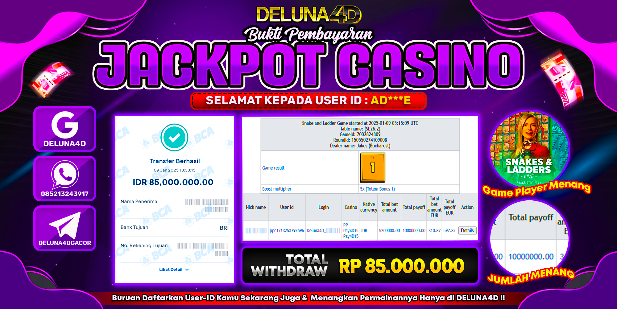 Selamat atas kemenangan User ID : AD***E, yang telah berhasil mendapatkan kemenangan di permainan LIVE CASINO SNAKES & LADDERS dengan kemenangan sebesar Rp85.000.000,- . Setelah mengisi formulir withdraw, hanya dalam jangka waktu 3-5 menitan tim layanan pelanggan DELUNA4D telah berhasil mengirimkan semua saldo kemenangan ke User ID tersebut.