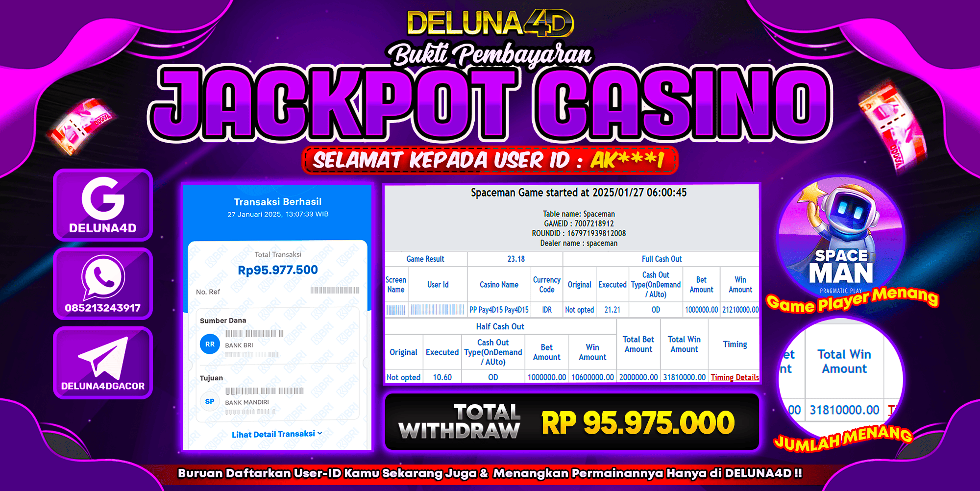 Selamat atas kemenangan User ID : AK***1, yang telah berhasil mendapatkan kemenangan di permainan LIVE CASINO SPACEMAN dengan kemenangan sebesar Rp95.975.000,- . Setelah mengisi formulir withdraw, hanya dalam jangka waktu 3-5 menitan tim layanan pelanggan DELUNA4D telah berhasil mengirimkan semua saldo kemenangan ke User ID tersebut.