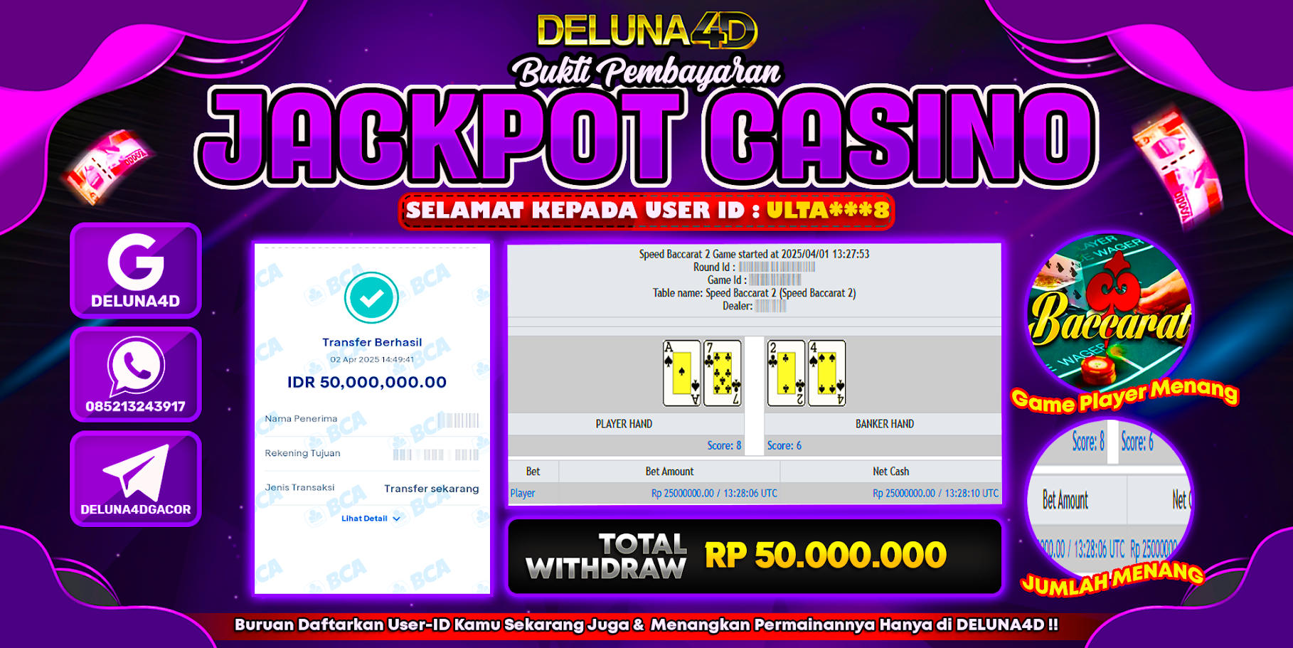 Selamat atas kemenangan User ID : ULTA***8, yang telah berhasil mendapatkan kemenangan di permainan LIVE CASINO SPEED BACCARAT 2 dengan kemenangan sebesar Rp50.000.000,- . Setelah mengisi formulir withdraw, hanya dalam jangka waktu 3-5 menitan tim layanan pelanggan DELUNA4D telah berhasil mengirimkan semua saldo kemenangan ke User ID tersebut.