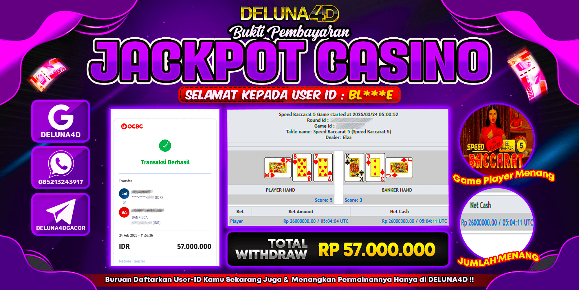 Selamat atas kemenangan User ID : BL***E, yang telah berhasil mendapatkan kemenangan di permainan LIVE CASINO SPEED BACCARAT dengan kemenangan sebesar Rp57.000.000,- . Setelah mengisi formulir withdraw, hanya dalam jangka waktu 3-5 menitan tim layanan pelanggan DELUNA4D telah berhasil mengirimkan semua saldo kemenangan ke User ID tersebut.