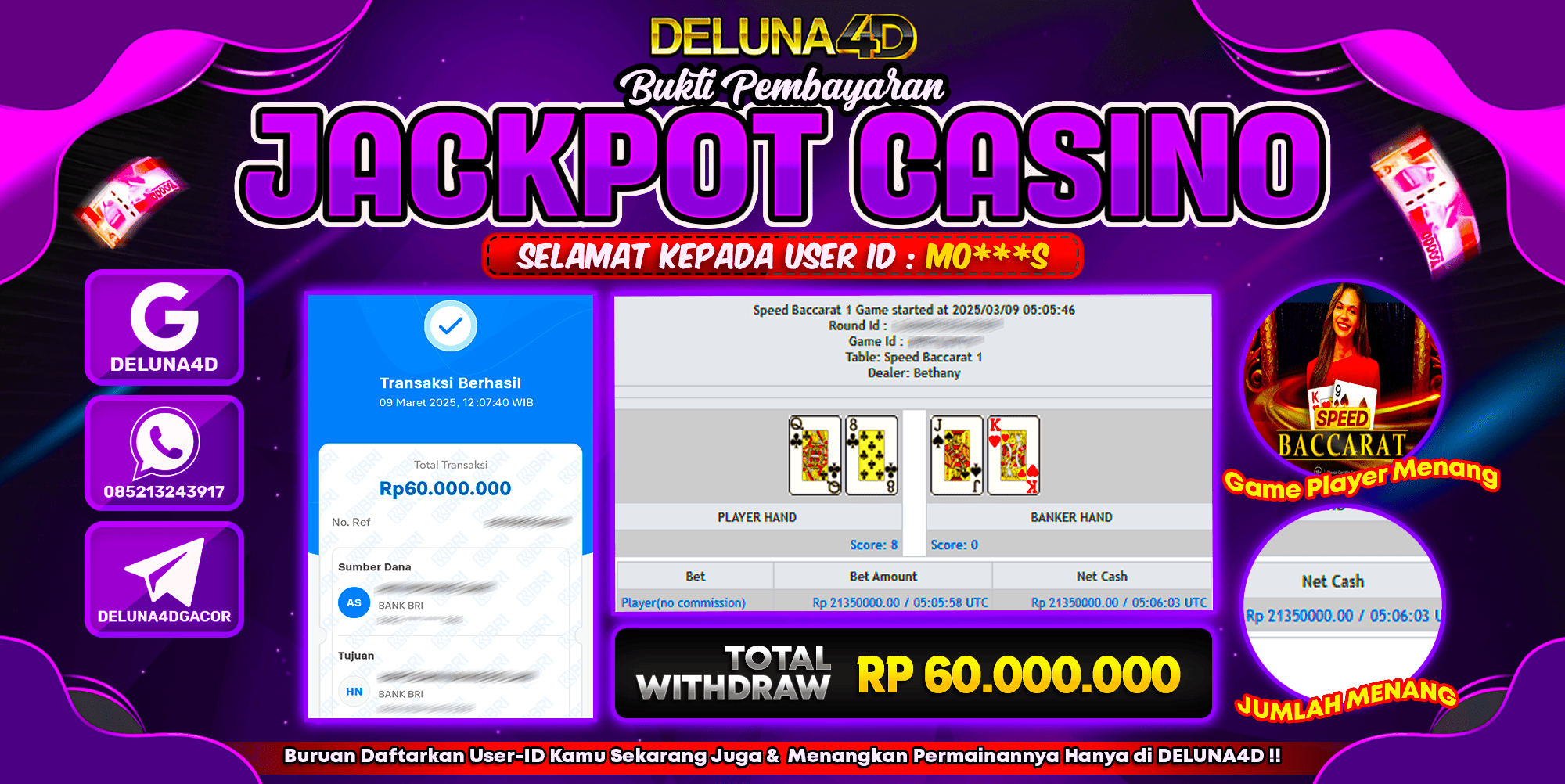 Selamat atas kemenangan User ID : MO***S, yang telah berhasil mendapatkan kemenangan di permainan LIVE CASINO SPEED BACCARAT dengan kemenangan sebesar Rp60.000.000,- . Setelah mengisi formulir withdraw, hanya dalam jangka waktu 3-5 menitan tim layanan pelanggan DELUNA4D telah berhasil mengirimkan semua saldo kemenangan ke User ID tersebut.