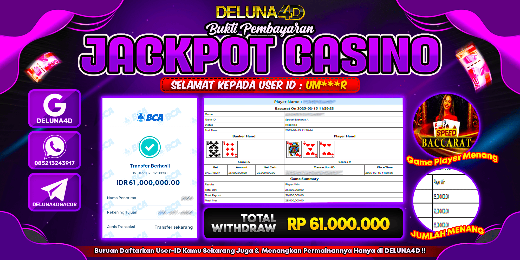 Selamat atas kemenangan User ID : UM***R, yang telah berhasil mendapatkan kemenangan di permainan LIVE CASINO SPEED BACCARAT dengan kemenangan sebesar Rp61.000.000,- . Setelah mengisi formulir withdraw, hanya dalam jangka waktu 3-5 menitan tim layanan pelanggan DELUNA4D telah berhasil mengirimkan semua saldo kemenangan ke User ID tersebut.
