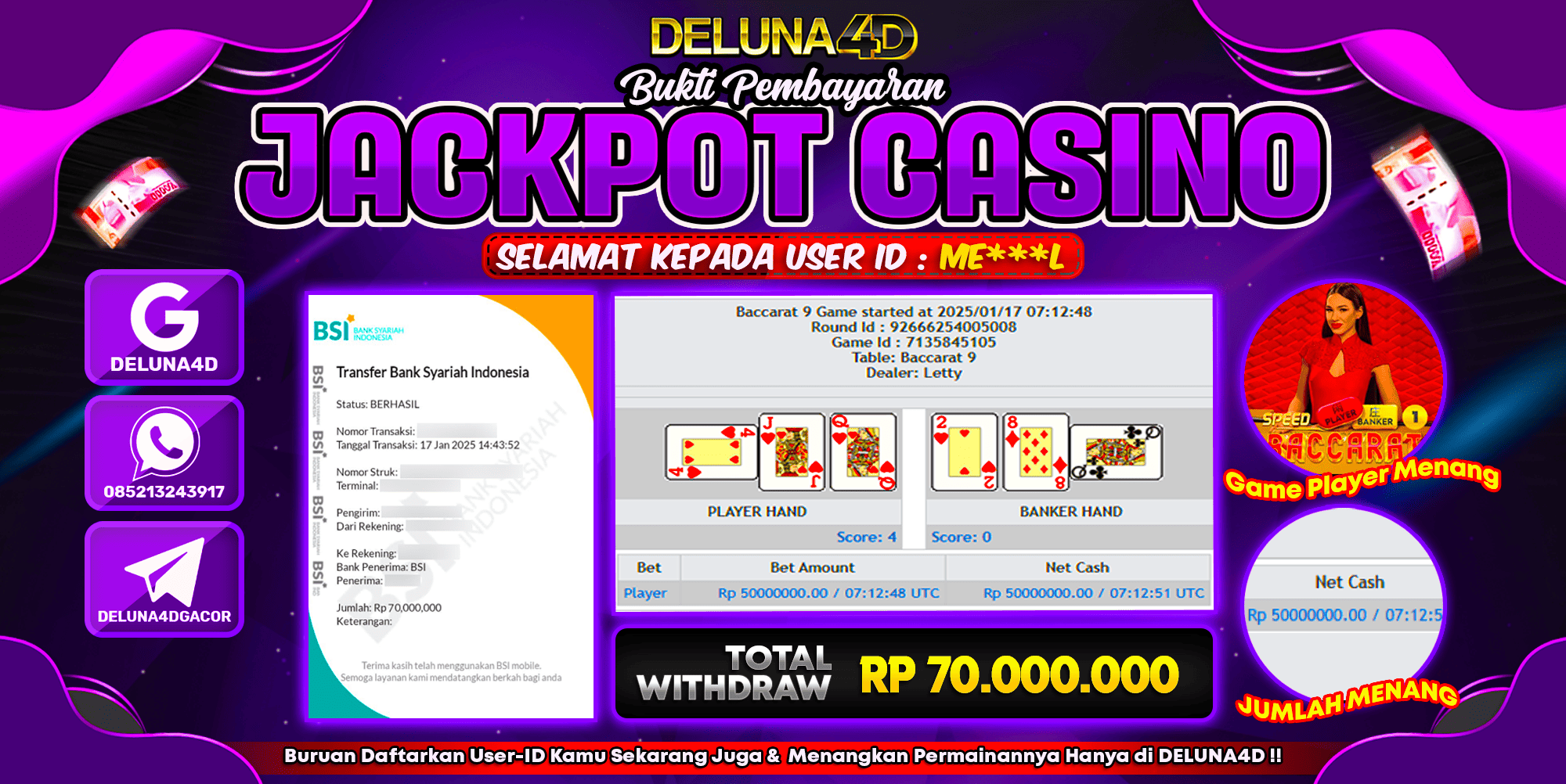 Selamat atas kemenangan User ID : ME***L, yang telah berhasil mendapatkan kemenangan di permainan LIVE CASINO SPEED BACCARAT dengan kemenangan sebesar Rp70.000.000,- . Setelah mengisi formulir withdraw, hanya dalam jangka waktu 3-5 menitan tim layanan pelanggan DELUNA4D telah berhasil mengirimkan semua saldo kemenangan ke User ID tersebut.