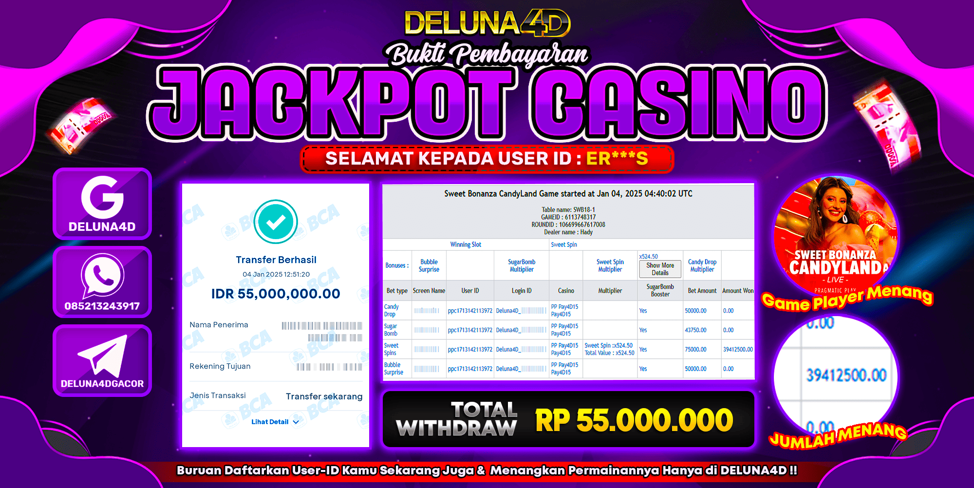 Selamat atas kemenangan User ID : ER***S , yang telah berhasil mendapatkan kemenangan di permainan LIVE CASINO SWEET BONANZA CANDYLAND dengan kemenangan sebesar Rp55.000.000,- . Setelah mengisi formulir withdraw, hanya dalam jangka waktu 3-5 menitan tim layanan pelanggan DELUNA4D telah berhasil mengirimkan semua saldo kemenangan ke User ID tersebut.
