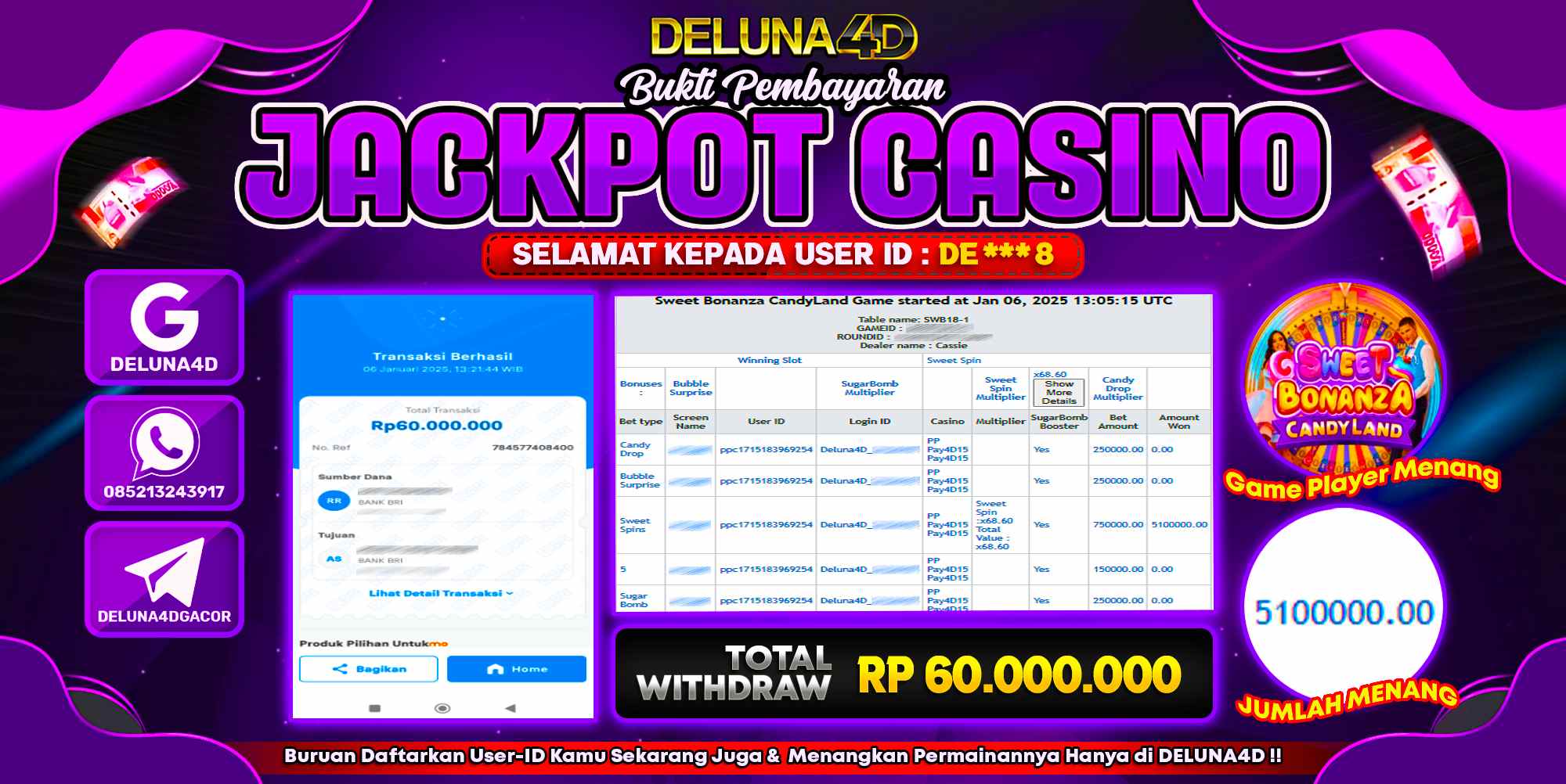 Selamat atas kemenangan User ID : DE***8, yang telah berhasil mendapatkan kemenangan di permainan LIVE CASINO SWEET BONANZA CANDYLAND dengan kemenangan sebesar Rp60.000.000,- . Setelah mengisi formulir withdraw, hanya dalam jangka waktu 3-5 menitan tim layanan pelanggan DELUNA4D telah berhasil mengirimkan semua saldo kemenangan ke User ID tersebut.