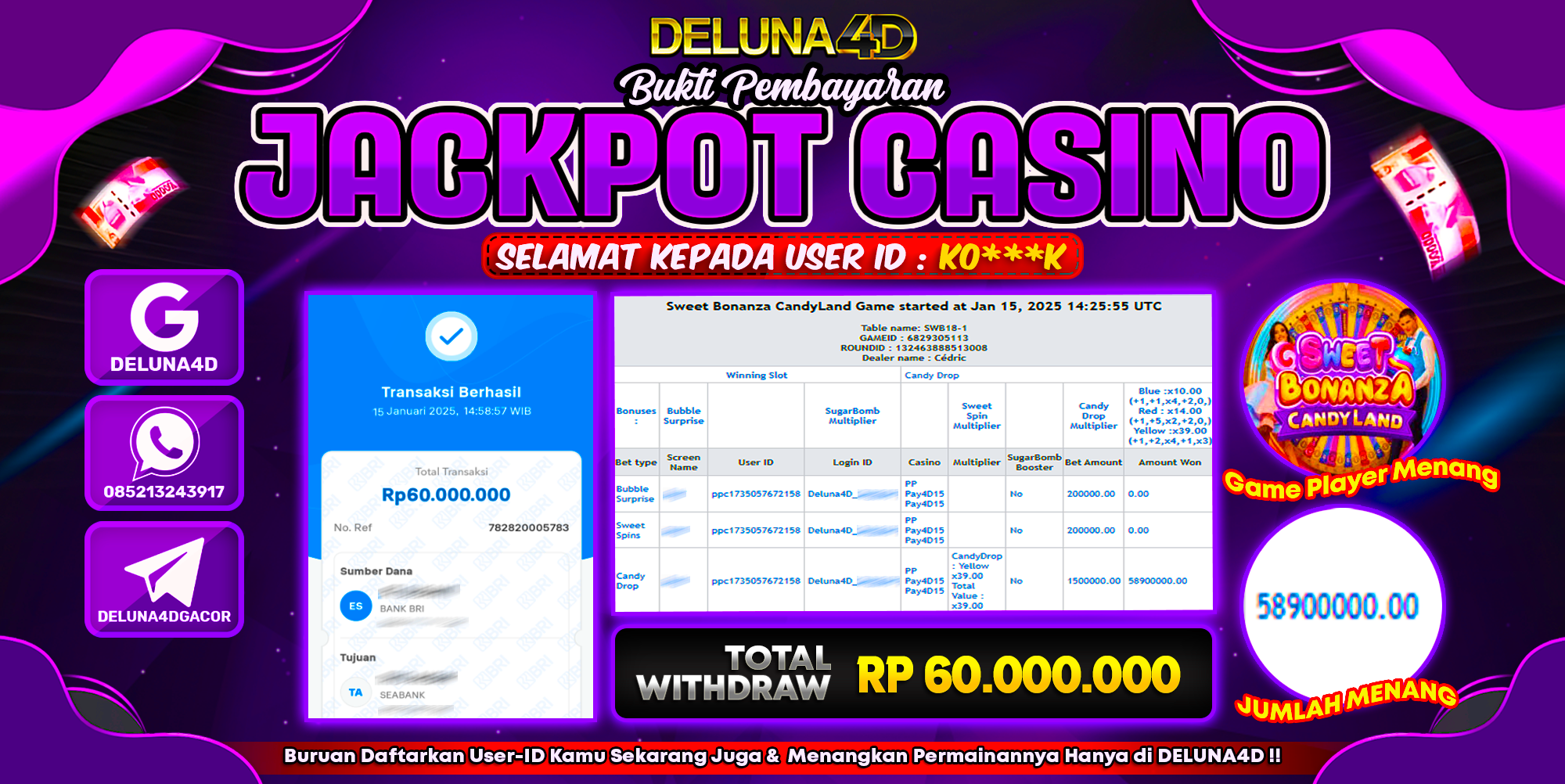 Selamat atas kemenangan User ID : KO***K, yang telah berhasil mendapatkan kemenangan di permainan LIVE CASINO SWEET BONANZA CANDYLAND dengan kemenangan sebesar Rp60.000.000,- . Setelah mengisi formulir withdraw, hanya dalam jangka waktu 3-5 menitan tim layanan pelanggan DELUNA4D telah berhasil mengirimkan semua saldo kemenangan ke User ID tersebut.