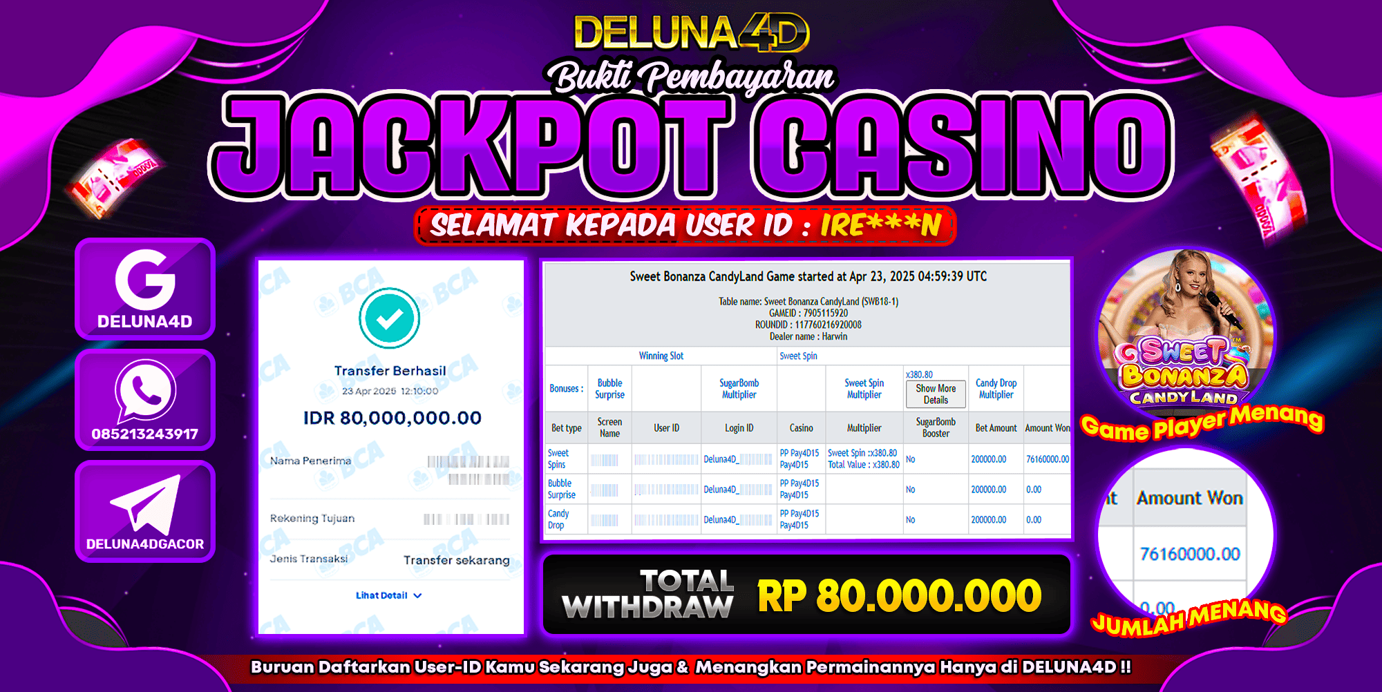 Selamat atas kemenangan User ID : IRE***N, yang telah berhasil mendapatkan kemenangan di permainan LIVE CASINO SWEET BONANZA CANDYLAND dengan kemenangan sebesar Rp80.000.000,- . Setelah mengisi formulir withdraw, hanya dalam jangka waktu 3-5 menitan tim layanan pelanggan DELUNA4D telah berhasil mengirimkan semua saldo kemenangan ke User ID tersebut.