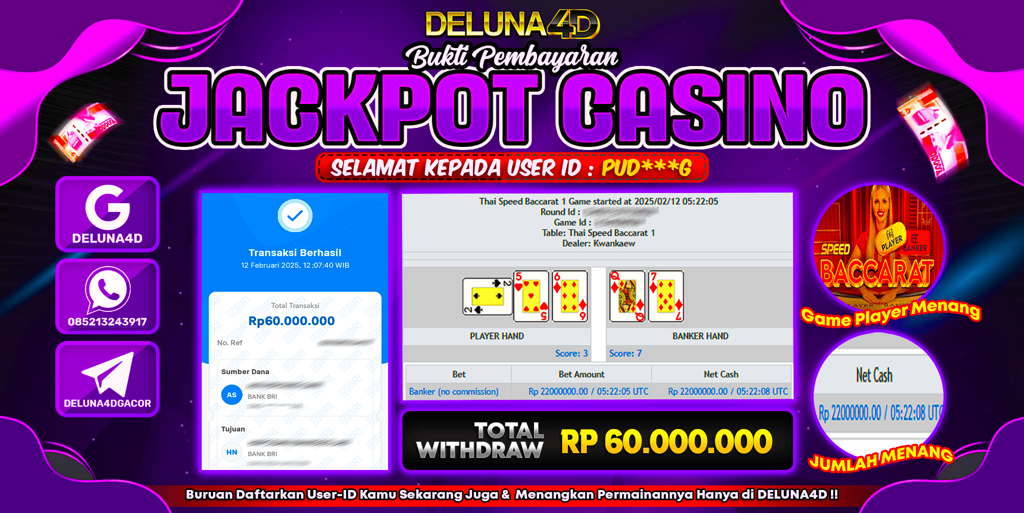 Selamat atas kemenangan User ID : PUD***G, yang telah berhasil mendapatkan kemenangan di permainan LIVE CASINO THAI SPEED BACCARAT dengan kemenangan sebesar Rp60.000.000,- . Setelah mengisi formulir withdraw, hanya dalam jangka waktu 3-5 menitan tim layanan pelanggan DELUNA4D telah berhasil mengirimkan semua saldo kemenangan ke User ID tersebut.