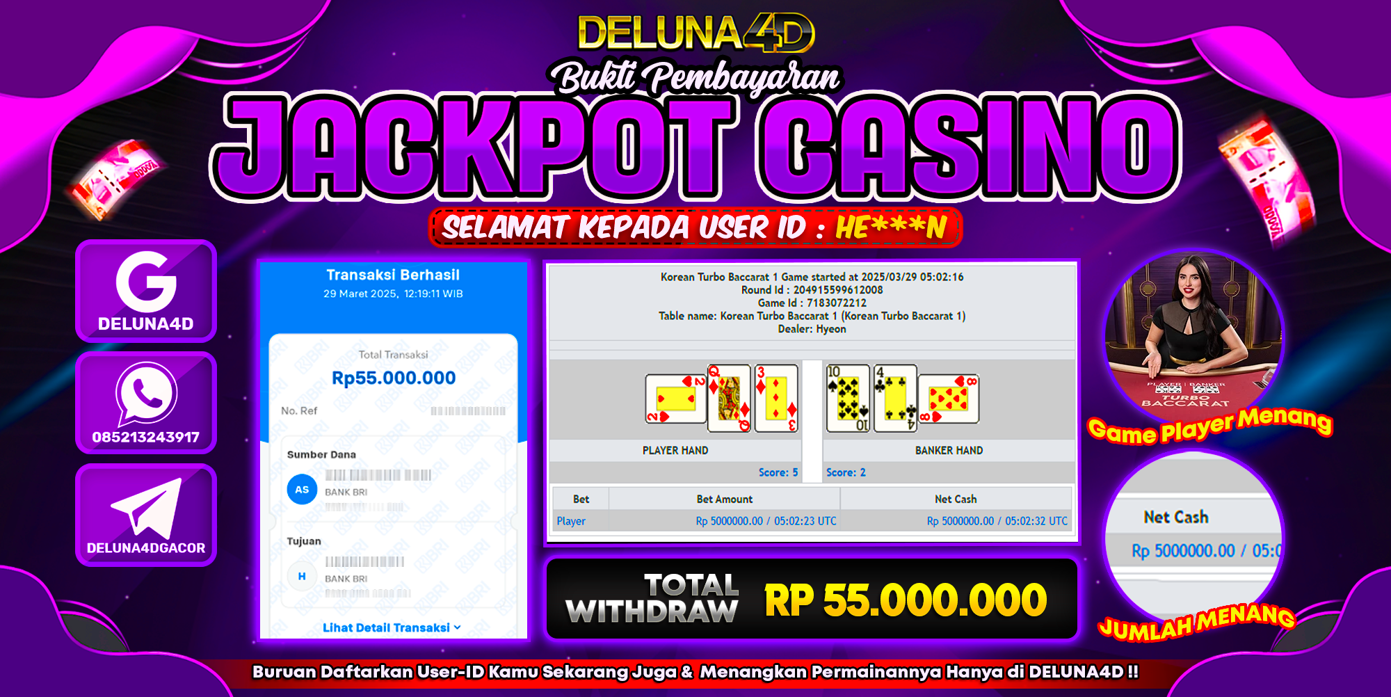 Selamat atas kemenangan User ID : HE***N, yang telah berhasil mendapatkan kemenangan di permainan LIVE CASINO TURBO BACCARAT dengan kemenangan sebesar Rp55.000.000,- . Setelah mengisi formulir withdraw, hanya dalam jangka waktu 3-5 menitan tim layanan pelanggan DELUNA4D telah berhasil mengirimkan semua saldo kemenangan ke User ID tersebut.