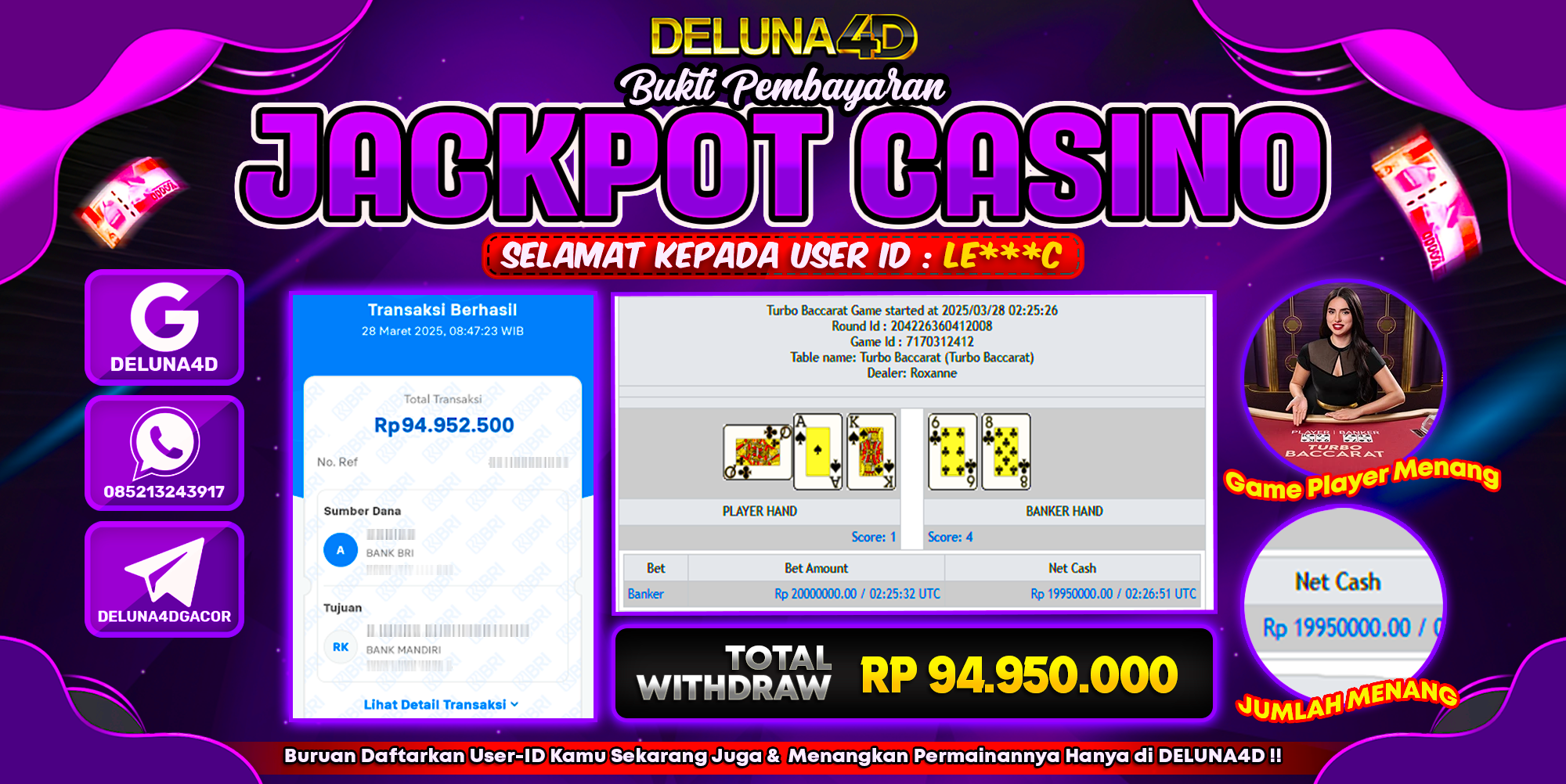 DELUNA4D JACKPOT LIVE CASINO TURBO BACCARAT Rp94.950.000,- LUNAS