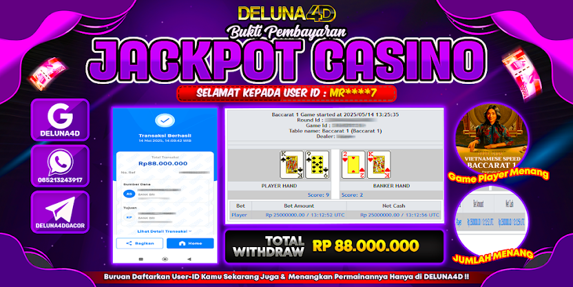 Selamat atas kemenangan User ID : MR***7, yang telah berhasil mendapatkan kemenangan di permainan LIVE CASINO -VIETNAMESE SPEED BACCARAT 1 dengan kemenangan sebesar Rp88.000.000,- . Setelah mengisi formulir withdraw, hanya dalam jangka waktu 3-5 menitan tim layanan pelanggan DELUNA4D telah berhasil mengirimkan semua saldo kemenangan ke User ID tersebut.