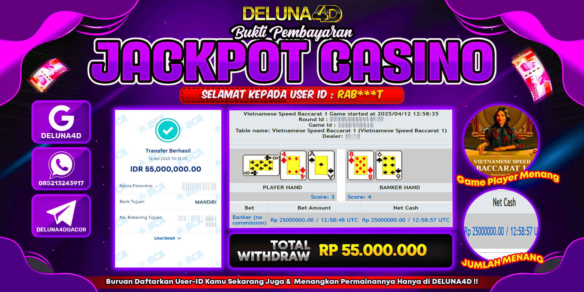 Selamat atas kemenangan User ID :  RAB***T, yang telah berhasil mendapatkan kemenangan di permainan LIVE CASINO VIETNAMESE SPEED BACCARAT dengan kemenangan sebesar Rp55.000.000,- . Setelah mengisi formulir withdraw, hanya dalam jangka waktu 3-5 menitan tim layanan pelanggan DELUNA4D telah berhasil mengirimkan semua saldo kemenangan ke User ID tersebut.