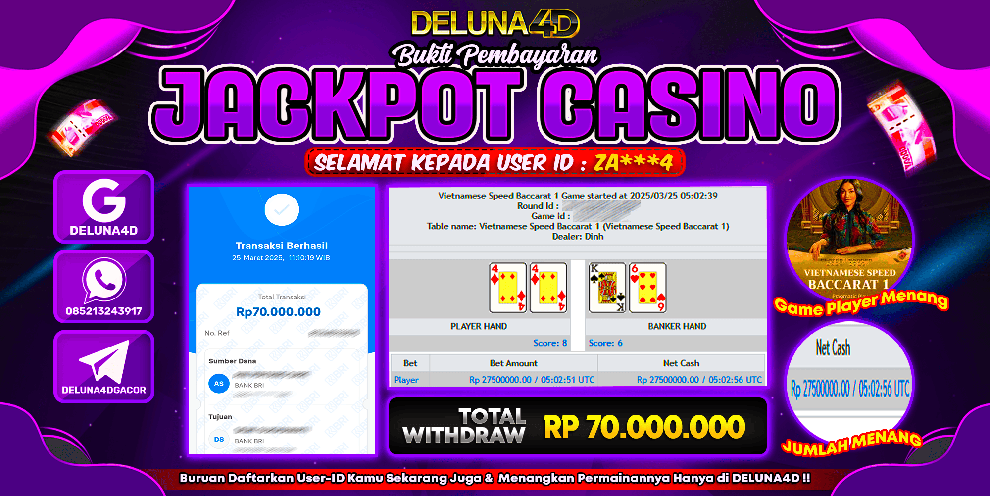 Selamat atas kemenangan User ID : ZA***4, yang telah berhasil mendapatkan kemenangan di permainan LIVE CASINO VIETNAMESE SPEED BACCARAT dengan kemenangan sebesar Rp70.000.000,- . Setelah mengisi formulir withdraw, hanya dalam jangka waktu 3-5 menitan tim layanan pelanggan DELUNA4D telah berhasil mengirimkan semua saldo kemenangan ke User ID tersebut.