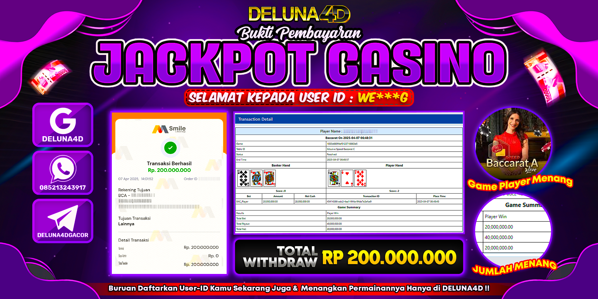 Selamat atas kemenangan User ID : WE***G, yang telah berhasil mendapatkan kemenangan di permainan LIVE CASINO XCLUSIVE SPEED BACCARAT dengan kemenangan sebesar Rp200.000.000,- . Setelah mengisi formulir withdraw, hanya dalam jangka waktu 3-5 menitan tim layanan pelanggan DELUNA4D telah berhasil mengirimkan semua saldo kemenangan ke User ID tersebut.