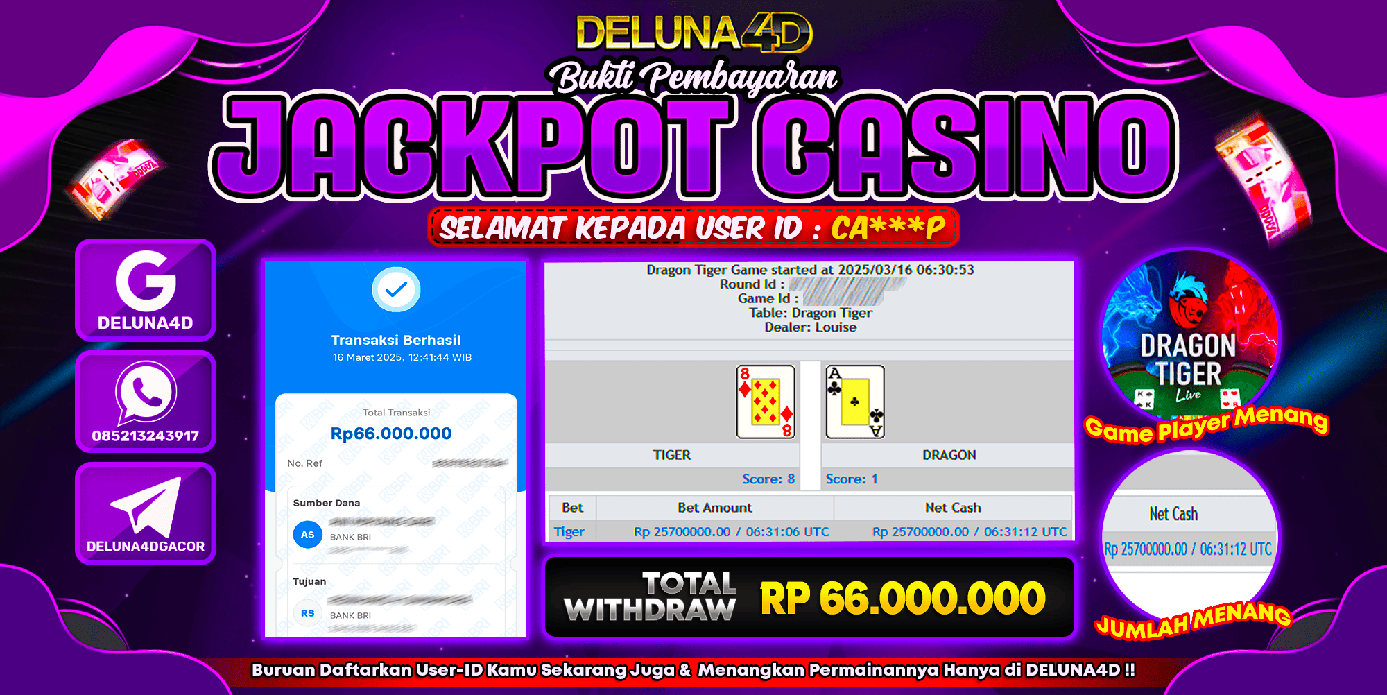 Selamat atas kemenangan User ID : CA***P, yang telah berhasil mendapatkan kemenangan di permainan LIVE CASINO PRAGMATIC DRAGON TIGER LIVE dengan kemenangan sebesar Rp66.000.000,- . Setelah mengisi formulir withdraw, hanya dalam jangka waktu 3-5 menitan tim layanan pelanggan DELUNA4D telah berhasil mengirimkan semua saldo kemenangan ke User ID tersebut.