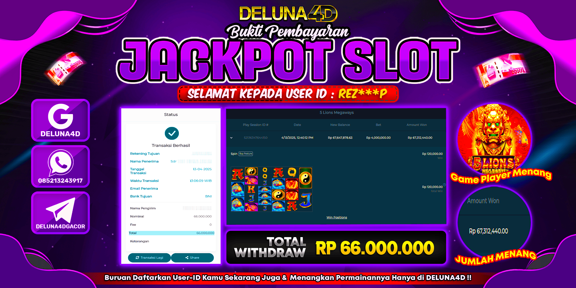 Selamat atas kemenangan User ID : REZ***P yang telah berhasil mendapatkan kemenangan di permainan SLOT 5 LIONS MEGAWAYS dengan kemenangan sebesar Rp66.000.000,- . Setelah mengisi formulir withdraw, hanya dalam jangka waktu 3 – 5 menitan tim layanan pelanggan DELUNA4D telah berhasil mengirimkan semua saldo kemenangan ke User ID tersebut.
