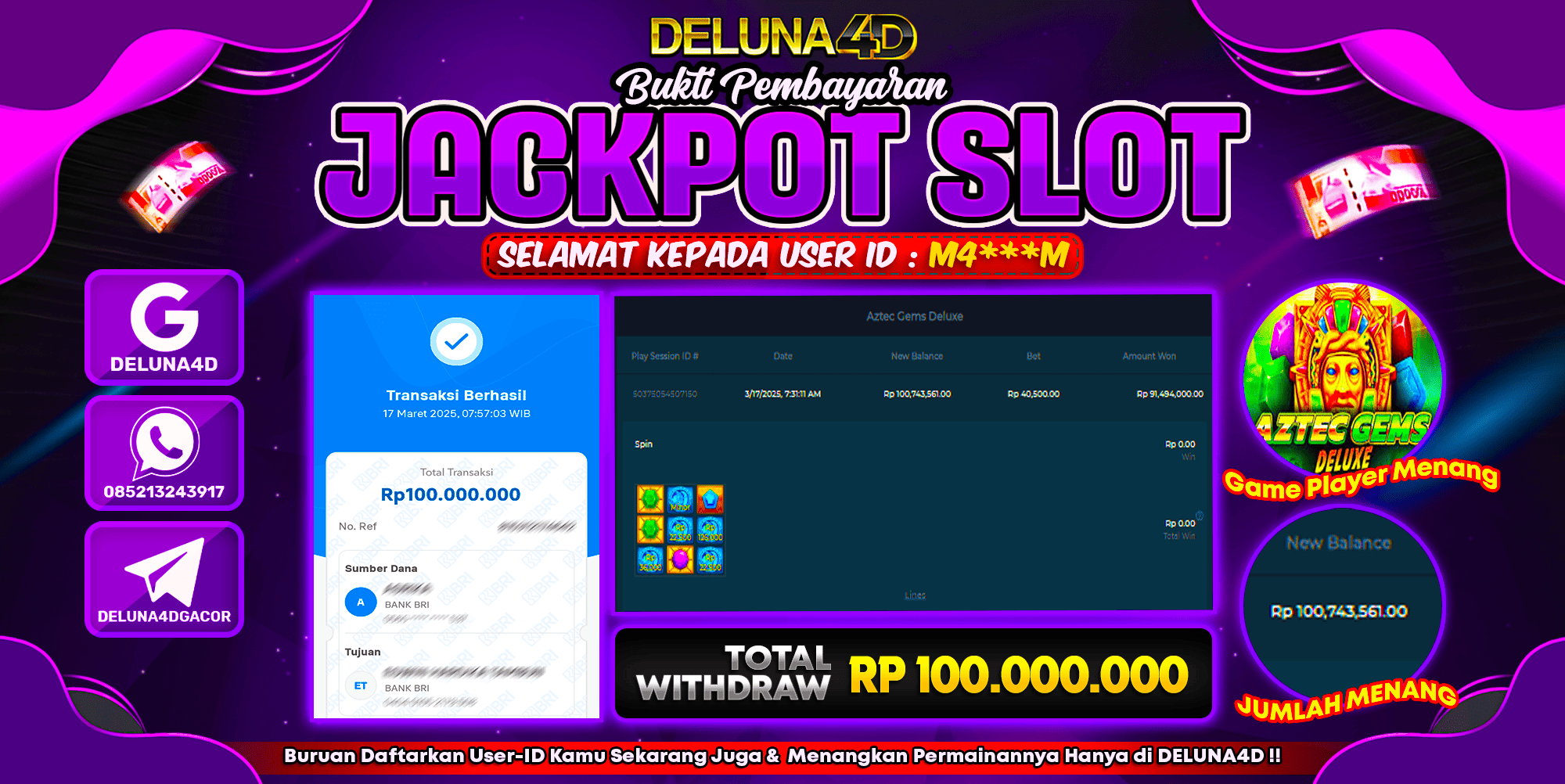 Selamat atas kemenangan User ID : M4***M yang telah berhasil mendapatkan kemenangan di permainan SLOT AZTEC GEMS DELUXE dengan kemenangan sebesar Rp100.000.000,- . Setelah mengisi formulir withdraw, hanya dalam jangka waktu 3 – 5 menitan tim layanan pelanggan DELUNA4D telah berhasil mengirimkan semua saldo kemenangan ke User ID tersebut.