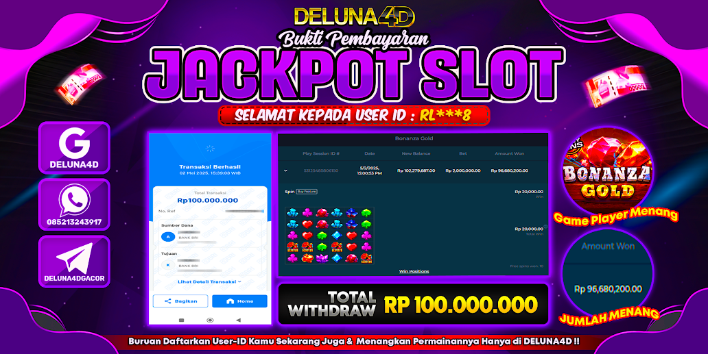 Selamat atas kemenangan User ID : RL***8 yang telah berhasil mendapatkan kemenangan di permainan SLOT BONANZA GOLD dengan kemenangan sebesar Rp100.000.000,- . Setelah mengisi formulir withdraw, hanya dalam jangka waktu 3 – 5 menitan tim layanan pelanggan DELUNA4D telah berhasil mengirimkan semua saldo kemenangan ke User ID tersebut.